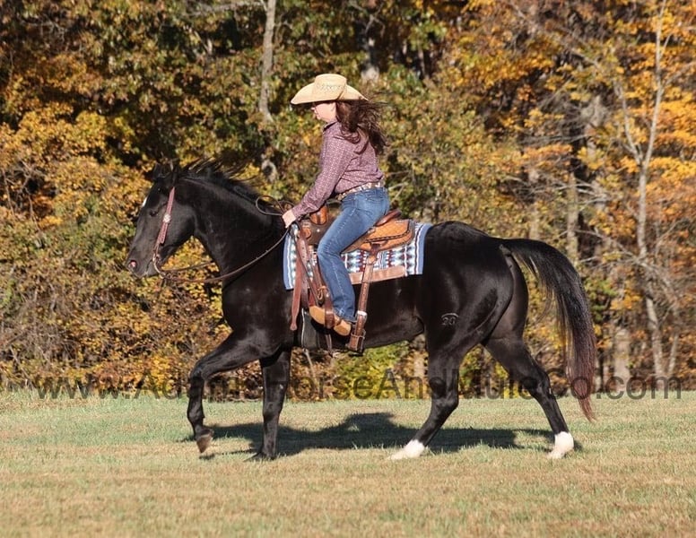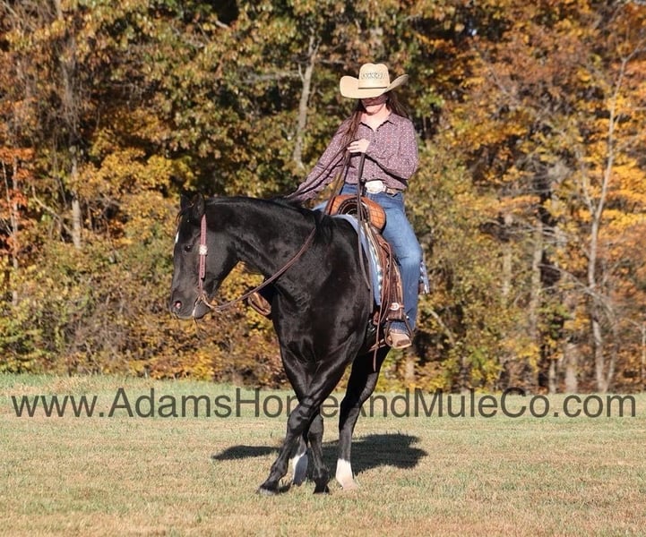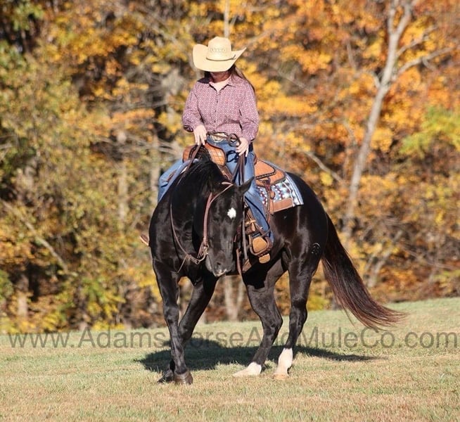 Go to www.AdamsHorseAndMuleCo.com for more pics and a video. AHAMC has been in the horse business and sold horses over the internet since 2005. We have a long track record of success with hundreds of happy customers. We work hard to match riders with the correct horses and specialize in beginner safe, family friendly horses that have been used and checked out by our family! Color Me Black aka Blackie is a well built jet black gelding standing 15.2hh. He is a 2012 Model registered in the AQHA with a good pedigree. Blackie has been used around the ranch checking cattle and he has roped and doctored several as well. He knows all about ranch work and is prepared to help you anytime that the situation calls for it! Blackie loves to just cruise along slow and easy down the trails and he is a horse that the whole family can ride and enjoy! He is an excellent trail horse and has been ridden in multiple states. He will cross creeks, ditches, logs and navigate rough rocky areas. He is safe riding in traffic. He has a smooth jog, a nice lope, has a good stop, turns a circle both ways and backs with ease! Blackie is a confident horse on the trails and will lead the crew or head out alone with no issues! He has been exposed to all kinds of wildlife such as deer or turkey and will go anywhere that he is asked too. He has been ridden many miles in the mountains of Eastern Kentucky and encountered every obstacle possible on the trail. He will go up or down even the steepest slopes, across deep creeks, over downed trees, and over all types of rough terrain while still being sure footed. Blackie is not cinchy, cold backed, does not crib or weave. Blackie is a horse that anyone would be proud to own and one that anyone will love!!! Feel free to call Eric 606-308-2461 with any questions.
