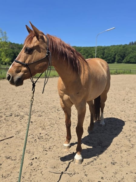 I am looking for a new, loving home for my Quarter Horse gelding, "Yankee." This is not an urgent sale, and he is not being sold as a school horse. It is important to me that Yankee finds his new home with experienced and gentle hands. Profile: * Name: Yankee * Breed: Quarter Horse * Gender: Gelding * Age: 14 years * Height: approximately 14.9 hh * Papers: available, registered with the American Quarter Horse Association (AQHA) * Training: Western, Reining * Health: healthy and robust, well-maintained hooves, occasional coughs in winter * Tack: available upon request * Location: near Darmstadt, Hesse About Yankee: Yankee is a sensitive, gentle gelding with solid reining training. Over the past five years, I have mostly ridden him in the field. He is very light to ride, enjoys groundwork, liberty work, and spending quality time with his handler. Those who take the time to get to know him will find a true heart horse that aims to please and impresses with his refined nature. In the arena, he works patiently and is eager to learn new things, often showing playful antics. He is not a beginner’s horse but requires an experienced, calm, and clear handler who can provide him with security, as he also has a sensitive side. In the field, Yankee behaves well in the company of another horse. I do not recommend riding him alone, as he tends to be more reactive when he perceives everything around him. Important: * Only serious inquiries, please. * A trial ride costs €50, which will be deducted from the purchase price if you decide to buy. Price: €7,500 negotiable If you feel addressed and are looking for a (second) horse to have fun with, learn from, and share a journey, I look forward to hearing from you.
