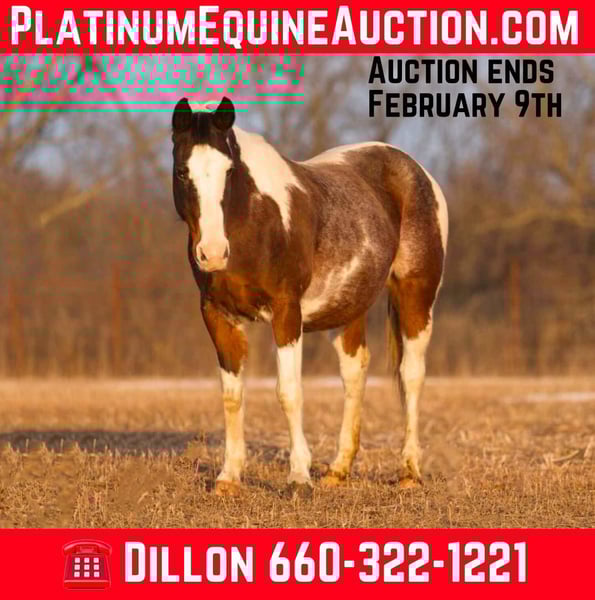 ONLINE AUCTION Place your bids at www.PlatinumEquineAuction.com Starting Bid $3500 Auction ends February 9th, 2025 Need a new saddle? Check out White Rock Saddles on our website or Facebook! Trixie is a 14yo Bay roan paint mare that stands 14.3 hands tall and has been used on the ranch from doctoring sorting loading cattle to taking the little ones out with dad to go ranch on and be a babysitter… safe for anyone with a nice one hand neck rein and a huge stop to her! Trixie rides out alone or in a group and doesn’t have the typical Marish attitude. She will fit right in with your geldings if you have them! Trixie has been with us the majority of her life and is ready to go teach some other kids how to ride and build their confidence! For more information please call Dillon Staton 660-322-1221 Located in Carrolton, MO. ONLINE AUCTION Place your bids at www.PlatinumEquineAuction.com Starting Bid $3500 Auction ends February 9th, 2025 Need a new saddle? Check out White Rock Saddles on our website or Facebook!