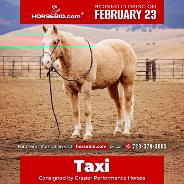 💎 𝐓𝐇𝐄 𝓓𝓲𝓪𝓶𝓸𝓷𝓭 𝐒𝐇𝐎𝐖𝐂𝐀𝐒𝐄 💎 Happening now thru MONDAY | FEBRUARY 23rd - Available EXCLUSIVELY on HorseBid's website! For more details and to register visit: www.Horsebid.com CONSIGNOR CONTACT: Grazier Performance Horses 720-378-3003 LOCATION: Winston, MT BREED: American Quarter Horse REGISTERED: Yes REGISTERED NAME: Hezalot of Cash COLOR: Palomino HEIGHT: 15.1 AGE: 15 GENDER: Gelding They say blondes have more fun and this palomino proves it. Meet Taxi, a 15-year-old registered AQHA gelding standing 15.1 hands and truly the definition of “the perfect package.” He has chrome, shape, substance, and a wonderful disposition. Taxi is the ideal size for riders big or small and has a genuine heart of gold. He has an outgoing personality, impeccable ground manners, and absolutely loves everyone he meets. Taxi is a phenomenal trail partner and isn’t bothered by creeks, logs, ditches, wildlife, or any other obstacle you may encounter. He’s been to town, seen the bright lights, and handled every situation with confidence. Taxi has a rocking-chair lope and the most comfortable jog. He is easy to ride, respects the bridle, neck reins one-handed, and responds well to leg cues. He has seen every aspect of ranch work and is no stranger to cattle. Taxi has been used to push, gather, sort, and load. He’s the first to greet you at the gate and an absolute dream to groom, saddle, bathe, clip, load, and shoe. Taxi is truly a joy to own and ride. If you’re searching for a one-in-a-million unicorn, Taxi is your guy. Watch his full YouTube video, feel free to reach out with any questions, or arrange a visit!
