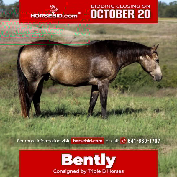 ♦️ 𝐭𝐡𝐞 𝐀𝐌𝐄𝐑𝐈𝐂𝐀𝐍 𝓕𝓪𝓵𝓵 𝓒𝓵𝓪𝓼𝓼𝓲𝓬 ♦️ Happening now thru MONDAY | OCTOBER 20th - Available EXCLUSIVELY on HorseBid's website! For more details and to register visit: www.Horsebid.com CONSIGNOR CONTACT: Triple B Horses 641-680-1707 LOCATION: Plano, IA BREED: QH REGISTERED: No COLOR: Buckskin HEIGHT: 15.2 AGE: 14 GENDER: Gelding Intoducing Bently! 15.2 hands tall, 14 years old and grade. He’s big, he’s dapped, he’s buckskin and he was the personality of a golden retriever. Seriously this guy is what dreams are made of! He is an easy keeper so your husband is sure to thank you for being easy on the wallet with up keep. He requires zero maintenance! Honestly I’m not even sure where to start to explain just how incredible this guy is. He transitions from his walk trot lope just as easy as a brand new car of the dealer lot. He has an easy one hand neck rein. Drink in one hand, steering in the other, point and go where you want! He is light in the mouth and responds great to leg pressure. He is very smooth and lopes nice collected circles on the correct lead. Bently has been used in all aspects of ranch work. We’ve ponied colts, pushed cattle, and some pasture roping. He is phenomenal on the trail! Point and go, nice slow and easy. He isn’t in a hurry and does try to rush through the rough patches. Bently is reliable, safe, and steady! He is the same horse every time you pull him out! No lunging needed just saddle and go! He is easy to catch, stands tied, tacks up easy, loads good, and gets along in a mixed herd. He is up to date on dental, worming, and coggins. He is safe for ALL levels of riders! Bently is 100% sound, he has a current PPE on file performed on 10/8/25. He does have a small bump on his back right pastern. I do have x-rays on file- this is only scar tissue and will never affect him. Please feel free to give me a call. I could talk about this guy all day long!