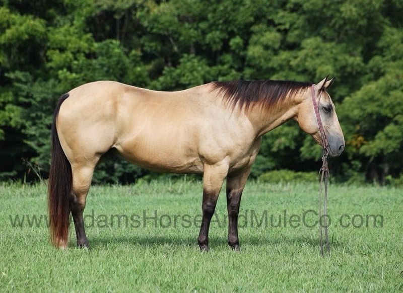 Go to www.AdamsHorseAndMuleCo.com for more pics and a video. AHAMC has been in the horse business and sold horses over the internet since 2005. We have a long track record of success with hundreds of happy customers. We work hard to match riders with the correct horses and specialize in beginner safe, family friendly horses that have been used and checked out by our family! Snack Pack is a stout built buckskin horse standing 14.3hh. He is a 2011 model registered AQHA gelding! Snack is the perfect horse for the whole family to enjoy! The kids have played on him for hours and he is very tolerant as he is a confidence builder, slow and easy is his preferred speed! He is a trail horse deluxe that will mosey along down the trails and he will never be in a hurry! He will cross creeks, ditches, logs and navigate rough rocky areas. He is safe riding in traffic. He has a very smooth lope, has a good stop, turns a circle both ways and backs with ease! Snack knows his way around the ranch and when asked he can go get the work done as well. Snack is a confident horse on the trails and will lead the crew, head out alone with no issues! He has been exposed to all kinds of wildlife such as deer or turkey or other animals like cows or dogs and will go anywhere that he is asked too. He has been rode many miles in the mountains of Eastern Kentucky and encountered every obstacle possible on the trail. He will go up or down even the steepest slopes, across deep creeks, over downed trees, and over all types of rough terrain while still being sure footed. Snack is not cinchy, cold backed, does not crib or weave. Snack is sure to be the family favorite for years to come!!! Feel free to call Eric 606-308-2461 with any questions.