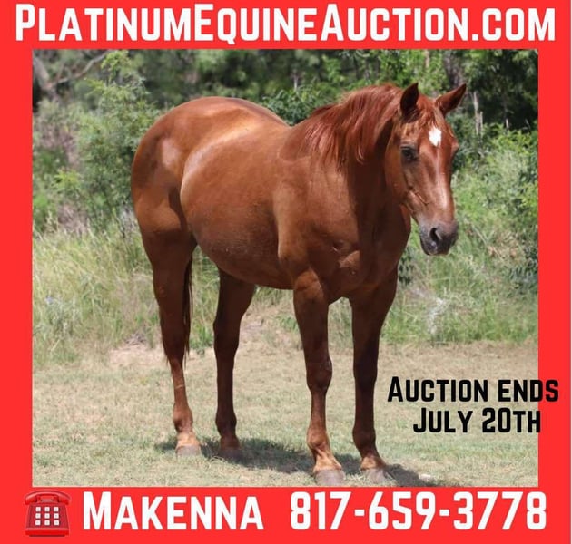 ONLINE AUCTION Place your bids at www.PlatinumEquineAuction.com Starting Bid $3500 Auction ends July 20th 2025 Need a new saddle? Check out White Rock Saddles on our website or Facebook How about this gorgeous gal? Cindy is started on the heel side, great trail horse, and just an all around fun mare to have in the barn! She is just 15 years old and 14.3hh tall! Cindy is very handy broke, has a nice turn around, big stop and super light in the face! She moves off your legs and lopes around smooth as butter right out of her tracks. She will carry flags, is good in traffic and on roads/highways. We hauled her to the famous Fort Worth Stockyards to ride her through the busy day downtown there and she didn’t ever have a care in the world, was just happy to be there! She is turned out with other mares and geldings, low on the pecking order and gets along with everyone. She also does very good stalled and eats and drinks well on the road. She stands to be saddled, stands good for the farrier and vet, and is easy to catch! Cindy is a clean slate ready for anyone to use! We are located in Lipan Texas and have hauling available anywhere in the U.S., Hawaii or Canada! Don’t miss out on this mare for the whole family! Please call or text Makenna Hartzell 817-659-3778. ONLINE AUCTION Place your bids at www.PlatinumEquineAuction.com Starting Bid $3500 Auction ends July 20th 2025 Need a new saddle? Check out White Rock Saddles on our website or Facebook