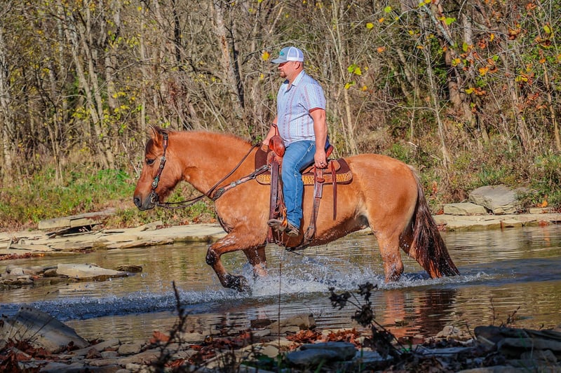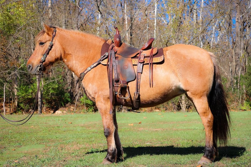 ONLINE AUCTION Place your bids at www.PlatinumEquineAuction.com Starting Bid $3500 Auction ends November 17th, 2024 Need a new saddle? Check out White Rock Saddles on our website or Facebook! This is “CHICKEN KABOB”, an extraordinarily gentle, quiet, and safe NORWEGIAN FJORD QUARTER HORSE CROSS MARE that is broke to ride and drive. This mare is family and youth friendly. She has been driven, ridden, and handled by novice equestrians and timid riders and drivers. She is quiet and will not go any faster than you ask of her. She stops with ease and stands patiently until asked to move out. She has been on weekend wagon trains, she has been in parades, and hooked to all farm machinery. She will plow the garden, haul the manure, and win blue ribbons in the hitch classes. She is very quiet to ride and will cross water and all other trail obstacles quietly. She rides out alone, is good to lead or follow in a group, and will go anywhere you ask her willingly. She is kind, patient, honest, and true every time you get her out. She stands quietly to be harnessed, hitched, mounted, tacked, and groomed. Excellent family horse the whole tribe can enjoy, whether you love riding or driving, you will appreciate her confident relaxed demeanor and her friendly personality. This mare is truly the hard to find kind. She is the right size, has the right temperament, the training, the ability, and the mind to make her new owners proud. She is 14 years old and stands an attractive and muscular 14.3 hands tall. For more info call HH Horses Erin 304-238-4155 Located in Flemingsburg, KY. ONLINE AUCTION Place your bids at www.PlatinumEquineAuction.com Starting Bid $3500 Auction ends November 17th, 2024 Need a new saddle? Check out White Rock Saddles on our website or Facebook!
