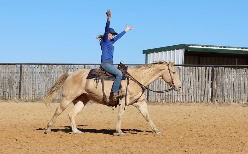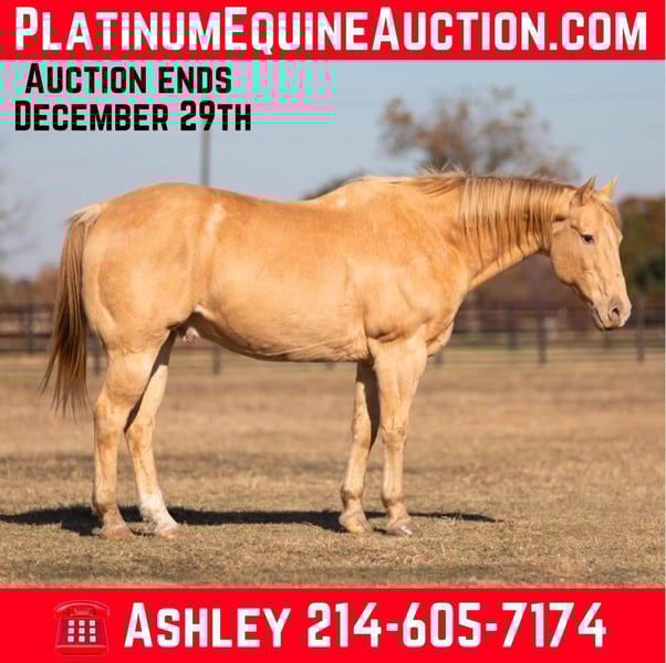 ONLINE AUCTION Place your bids at www.PlatinumEquineAuction.com Starting Bid $3500 Auction ends December 29th, 2024 Need a new saddle? Check out White Rock Saddles on our website or Facebook! Budge is a super unique color and you won’t find another one like him if you go to a parade, trail ride, or any other local event. He is a golden champagne – and he looks a lot like a palomino in his big winter hair, but he still shines and glows even long haired! But… in the summer…. he is absolutely stunning!!! His color is crazy, and so shiny that he almost looks like a mirror – he turns golden, almost metallic colored – very unique!!! You do not see these everyday. Budge is your ride if you’re looking for something simple, no- nonsense, and about as smooth as they come without being a gaited horse! He has an awesome little hobby horse lope, super balanced and easy for anyone. He is uncomplicated to navigate, with a very simple old-school style handle, he neck reins easily and guides wherever you point him. You don’t have to know a lot to ride this one. Budge has been used for riding lessons and is currently being used in our own lesson program. He has taught many kids and novices to ride. When he was younger he was used on a working ranch, and he is very comfortable in the pens and around cattle. If you are looking for one to check your place on and occasionally move a few cows, this guy can do that in his sleep. He has also been to lots of organized trail rides, local 4-H shows and local open shows, play days at the Cowboy Church, and tons of parades. He is very relaxed on trail rides and is exceptionally quiet and relaxed in town. He hops right on the trailer and hauls like a seasoned pro rodeo horse and he backs out relaxed and quietly. He is always happy to go somewhere. He is easy to catch, comes up to you anywhere, gets along well with other horses, is happy in the barn or turned out, he is a very easy keeper, and the type of horse you can leave out for a year and go grab him and hop on and enjoy your ride. Budge has front shoes on, and was just shod last week, and he also had his teeth done by an equine dentist this month. Watch his video and to see additional videos, go to our website: BusterHorses.com or our Facebook page Buster Horses Please call anytime for more information Buster Horses Ashley 214-605-7174 Budge is located in Weatherford, TX – one hour from Dallas / Fort Worth International Airport. He is an easy day trip or fun overnight trip to come try out, from anywhere! We are experienced, knowledgeable sellers, and we can help with quickly arranging affordable shipping to any buyer’s location – we have experience shipping worldwide – including regularly to Hawaii, Canada, Mexico, Europe, and South Africa. Check our website for buyer reviews, more videos, additional info etc: https://busterhorses.com/Budge ONLINE AUCTION Place your bids at www.PlatinumEquineAuction.com Starting Bid $3500 Auction ends December 29th, 2024 Need a new saddle? Check out White Rock Saddles on our website or Facebook!