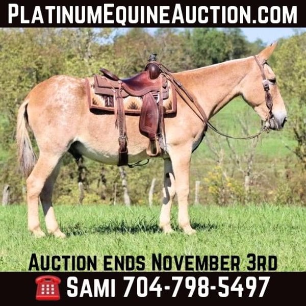 ONLINE AUCTION Place your bids at www.PlatinumEquineAuction.com Starting Bid $3500 Auction ends November 3rd, 2024 Need a new saddle? Check out White Rock Saddles on our website or Facebook! Rhodey is a 14 year old, 15.3 hand John mule. He is as quiet and gentle as they come as well as friendly and in your pocket. Rhodey has had extensive training throughout his life and is a joy to ride. He walks, jogs, and lopes nicely. He rides gathered up and soft in the bridle like one should. One step and he’s in a rocking chair lope. He neck reins and works off the leg. Backs and side passes nicely. He’s been shown in local horse shows and is competitive against the horses. You can open and close gates with him. As for trail riding, he is a dream. He goes through deep water, isn’t afraid of deer or turkeys when coming across them. He steps over logs and will leave the group when asked. He also rides out alone. Rhodey is traffic safe if you need to ride on the road or want to take a quick ride through town. There isn’t a way to ride him wrong. Bareback, with a saddle, or 2 or 3 kids lined up down his back. He is fun and a mule you can trust! He stands nicely for the farrier, is easy to clip, ties well and travels nicely. Rhodey is not a mule you have to ride everyday. You can give him the entire winter off and when you come back to ride him in the spring, he is just the same as he was at the end of summer. For more information, please call/text Sammi Waugh 704-798-5497 Located in Brooksville, KY. ONLINE AUCTION Place your bids at www.PlatinumEquineAuction.com Starting Bid $3500 Auction ends November 3rd, 2024 Need a new saddle? Check out White Rock Saddles on our website or Facebook!