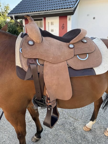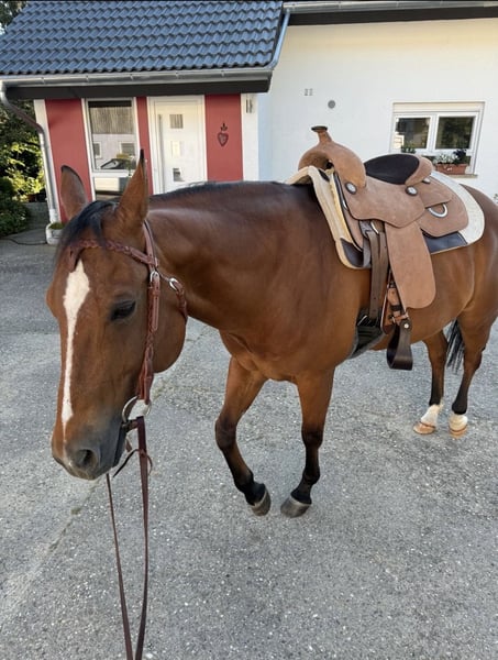 Please read carefully! Unfortunately, due to various personal reasons, I will need to rehome my horse if I find the right person for him. My dream would be for him to stay where he is and not have to move, but this is not a must. He is a 17-year-old Quarter Horse gelding, who has been used mainly for leisure riding in the countryside and occasionally in the arena. Therefore, he is only suitable as a leisure horse. He is polite, no nicks, well-behaved, somewhat lazy, but can also give a bit of gas when asked. In the field, he is fearless and brave. He measures approximately 150 cm, is barefoot with hoof boots, as he is a bit sensitive without them. Since the beginning of the year, he has been diagnosed with equine asthma and is currently symptom-free, thanks to a dust-free environment I’ve provided with an open stall, plenty of turnout, dust-free hay, and shavings bedding. He may have a slight osteoarthritis in his left knee, which does not cause him problems but is why I tend to ride him longer in the winter. It does not restrict him in walk, trot, or canter, and he moves without issues. I suspect it only because he is a bit more sluggish at the beginning on cold days or doesn’t like to lift his hoof as high as usual. After movement, these issues completely disappear. With increased activity and muscle development, it improves significantly. Currently, I lack the time, so he has lost some condition. He is sold as a fully rideable leisure horse, and I wish for him to go to someone who can ride him daily. Whether ground work, lunging, pole work, desensitization training, riding in the arena or in the field, he does everything well. He is happiest in the terrain, whether alone or with others. He is regularly dewormed, vaccinated, and had his teeth done this year. He has AQHA papers and has been with me for five years. I love him very much, which is why I can only consider rehoming him to someone I see as a good match. I am aware that he has some baggage, so he is being offered at a very fair price for a perfect new home. I want to emphasize that he is fully rideable and unconditionally sound. He is not a companion horse but enjoys running and working. The custom-made Western saddle from CR (California Ranch), including a mohair pad from 5 Stars, can be purchased additionally, as well as a hay steamer from Haygain if needed. The price listed is for the horse only. Further details only in personal contact. I am looking for a mature, experienced, reliable partner for my horse who appreciates a solid horse. Feel free to contact us with a brief introduction about yourself; we look forward to hearing from you. It’s probably unnecessary to mention, but dealers and riding schools are not suitable. He needs a human who loves him.