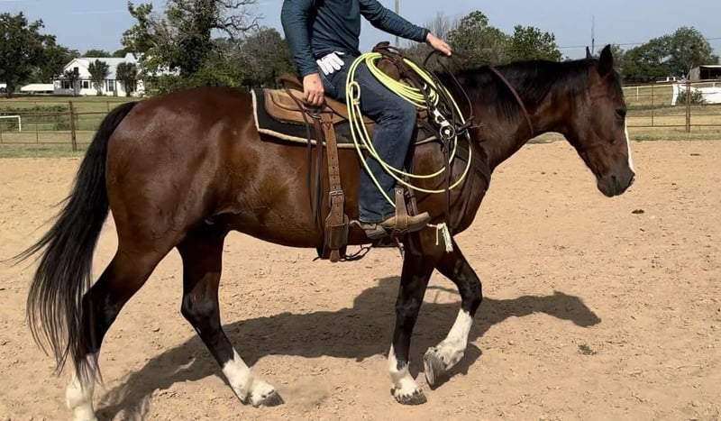 ONLINE AUCTION Place your bids at www.PlatinumEquineAuction.com Starting Bid $3500 Auction ends October 13th, 2024 Need a new saddle? Check out White Rock Saddles on our website or Facebook! Riggin is a 15.1H, 15 yr old grade bay gelding. He has been a personal switchender of ours for several years and carries our brand. Only horses that have had a profound impact on our lives get the honor to be branded in our program. He is a confidence booster for a beginner to learn how to rope on, or an absolutely safe mount anywhere for anyone! He’s one you can trust your kids on in the roping pen to the pasture! Broke broke broke with a really nice handle. Please give us a call for more info, it would simply take too long to type about how good this gelding is. He is everything you want in a confidence booster, first rope horse, old lady trail horse, kid lesson horse, or ranch horse. Riggin’ will give you a mile when you ask for an inch. He was born to please and will absolutely not step out of line. He is very very special to us and we wouldn’t mind holding him until our son can ride solo, but that wouldn’t be fair to the person that needs one like him today. Riggin is extremely comfortable at all gaits and has the very comfy rocking chair lope. He’d be the perfect horse for a beginner roper on either side. He’s 100% calm cool and collected in the box and puts you exactly where you need to be on both sides! You don’t have to rope on this horse to enjoy him though! He is a solid, sane citizen and anyone will stay safe on his back! He’s seen everything there is to see and takes to town, cars, bikes etc great! We’ve taken him multiple times to the stockyards to enjoy a cold beer on a Saturday night. Riggin is the old ranch horse everyone is asking for but no one can find because few too many like him ever come available! He’s UTD on all things and is ready to go! More pics and videos, including roping footage will be on his website page at northtexashorsecompany.com/riggin and the video of him at home was his first ride in MONTHS! This gelding is the same horse every single ride and doesn’t need “refreshed” after months off! ZERO buck, bolt, rear or bad habits. This guy will take care of anyone!! Please call Blair with North Texas Horse Company for more info at 817-757-3046. We are located in Weatherford, TX and can help arrange affordable shipping to anyone!! ONLINE AUCTION Place your bids at www.PlatinumEquineAuction.com Starting Bid $3500 Auction ends October 13th, 2024 Need a new saddle? Check out White Rock Saddles on our website or Facebook!