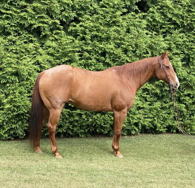 Beau es un tierno y dócil potro de raza Quarter Horse, de pelaje roan rojo.