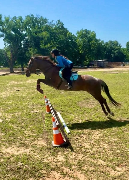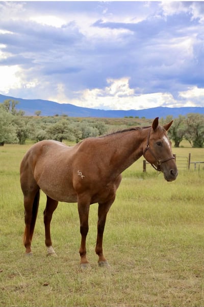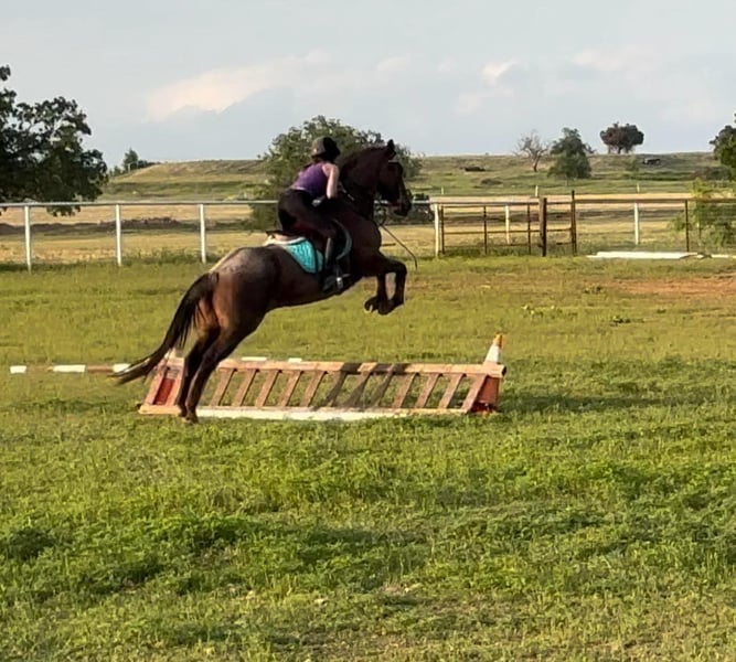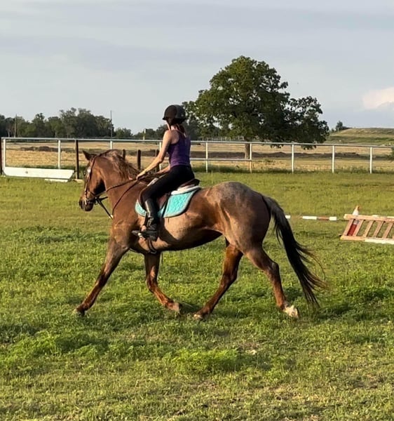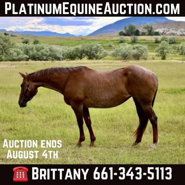 ONLINE AUCTION Place your bids at www.PlatinumEquineAuction.com Starting Bid $3500 Auction ends August 4th, 2024 Need a new saddle? Check out White Rock Saddles on our website or Facebook! This mare is the total package! Alice is a well rounded 15yr old Red Roan Mare. She stands between 15.2 and 15.3 hands. She is deep bodied and big boned. She is very versatile, excels English & Western. She is extremely well broke, carries herself correctly in every way, has a beautiful trot and breaks at the poll nicely. She is calm and confident when under saddle. She has been jumping a course of fences for the past 6 months, she has been in the PPH program for over a year. Her first schooling show she won all 6 classes shown 18” to 2’6. She would also excel in the jumper division or 3 day eventing. She has jumped 3’ with a ton of scope to go higher. Her lead changes are a work in progress but with added leg, she will change over a fence. She has done ranch work, been roped on and is lightly patterned on the barrels by an NFR Qualifier. She has seen all the bright lights and loud music of the rodeos. She has also been trail ridden a lot both in Texas and in the mountains of Wyoming. She loves water, will cross bridges and walk over downed logs. She stands quietly to be saddled/mounted and will even put her head down to be bridled. She can be intimidating due to her size, power and her buttons, I would recommend an intermediate rider. She has been ridden and jumped by a 12 year old girl regularly. If she doesn’t know you, she will be quirky and cautious on the ground at first. Once she warms up to you, she LOVES attention and is very sweet. She has been barefoot and has been shod, has not required any maintenance. She is up to date on her teeth, farrier, vaccines and worming. She passed a lameness exam with flexions on 5/22 and they also verified her age. This is a mare that is so versatile and will be someone’s lifelong partner. Contact Brittany Sporer 661-343-5113 with any questions. Located in Stephenville, TX. ONLINE AUCTION Place your bids at www.PlatinumEquineAuction.com Starting Bid $3500 Auction ends August 4th, 2024 Need a new saddle? Check out White Rock Saddles on our website or Facebook!