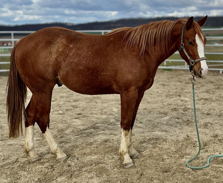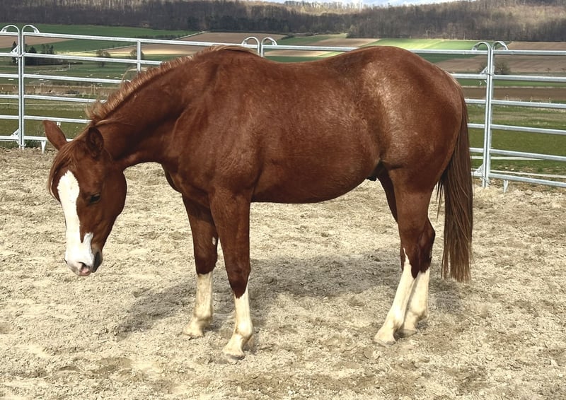 Sorrel with 4x white ! Liroy is a super handsome and perfectly built yearling. A top young sport and leisure partner who has a lot of potential. He has very nice movements and a great foundation. Standing in the old Quarter type. He has a very cool and old branch pedigree. Sire Ricochet Rooster , Gallo del Cielo And mom a Shine N Mister , Shining Spark , Smart Little Lena mom ! Nrha Germany paid in On request EWU