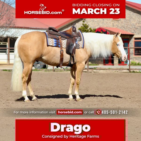 ⚜️𝓽𝓱𝓮 𝐆𝐎𝐋𝐃 𝓢𝓮𝓵𝓮𝓬𝓽⚜️ Happening now thru MONDAY | MARCH 23rd - Available EXCLUSIVELY on HorseBid's website! For more details and to register visit: www.Horsebid.com CONSIGNOR CONTACT: Heritage Farms Marie: 405-501-2142 Andy:801-644-9500 Tyler: 940-395-5608 LOCATION: Farr West, UT BREED: American Quarter Horse REGISTERED: Yes REGISTERED NAME: HF Drago COLOR: Palomino HEIGHT: 14.2 AGE: 3 GENDER: Gelding “Drago“ is a standout palomino gelding that will turn heads wherever he goes.He greets you at the front of his stall with brights eyes and happy ears, ready to work or just enjoy your company.He gets along well with other horses and is extra careful around kids.Drago is as broke as they come on the ground and under saddle.As you can see on his detailed video, every one can handle him and he is a dream to ride. His “been there, done that“ old soul demeanor makes him very special.The sky is the limit for this gelding.Ranch Riding,Reining,Roping or just the perfect partner on trails, he can do it all.He is Riata Buckle Eligible(high dollar Rope Horse incentive) has 1 year of professional reining training under his belt and comes out begging for more knowledge everyday.He is powerful and athletic yet quiet and user friendly. He rides the same whether you want to ride him daily or just once a week.He stands quietly at farrier or veterinary services, loads and unloads easy in trailers and ties patiently.Drago comes with no vices and a recent veterinarian exam. He's an easy keeper but won’t say no to carrots and horse cookies. Please feel free to contact us with any more questions about him.we are happy to help!