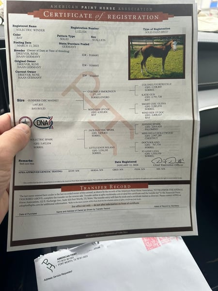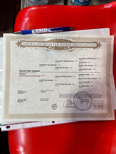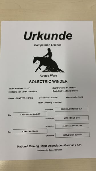 ❗️OFFERED FOR YOUR CONSIDERATION❗️ ⭐️Solectric Winder⭐️ Ozzy ist ein 2023 geborener Quarter Horse / Paint Horse Wallach. Er steckt gerade in der Grundausbildung mit bereits begonnenden Reiningmanövern, er befindet sich auf dem Wege ein vielversprechendes Showpferd zu werden. Ozzy ist überaus lieb im Umgang und verlade-sowie schmiedefromm. Als ausdrucksstarkes Pferd mit dem besonderem Look, auffälliger Blesse, toller Farbe und viel Behang ist er immer ein Blickfang. Ozzy ist NRHA Germany und European, sowie PHCG nominated. Dam: Solectric Spark mother of money earner. Von Jacs Electric Spark Sire: Gunners Chic Magnet LTE: over 60.000$ PE: over 80.000 $ Bei Interesse dürfen Sie uns gerne kontaktieren. 0173/7164511 0171/6840395 Standort: 31595 Steyerberg