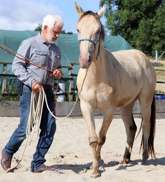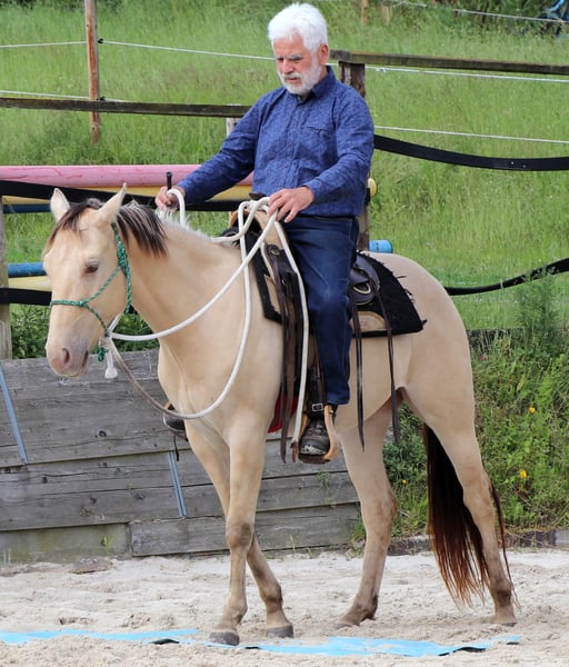 Zeb King Maxen - een beeldschone Quarter Horse ruin, geboren op 2 mei 2022. Met zijn zeldzame en buitengewone kleur Amber Champagne Dun trekt hij alle blikken op zich. Hij zal een geschat eindformaat van ongeveer 148 cm bereiken en is compact, correct gebouwd en stabiel - met veelbelovende verhoudingen die hem tot een echt allroundtalent maken. Zeb is gezond, genetisch 6-Panel n/n via de ouders en is uiteraard leeftijdsgeschikt gevaccineerd en ontwormd. Hij groeit op in een gemengde kudde in een buitenstal, waar hij onder de beste omstandigheden veel rust en veiligheid heeft ervaren. Zijn karakter is net zo overtuigend als zijn exterieur. De ruin is mensgericht, nieuwsgierig, zenuwsterk en ontspannen. Tegelijkertijd is hij oplettend, leergierig en moedig tegenover nieuwe taken. Zeb is braaf, eenvoudig in de omgang, goed opgevoed en leert snel - de beste voorwaarden voor een betrouwbare samenwerking op lange termijn. Momenteel wordt hij voorzichtig en met veel gevoel voorbereid op zijn leven als rijpaard volgens de principes van Natural Horsemanship. Hij is bereden en toont zich daarbij zeer braaf en ontspannen, ook in het terrein. Met zijn goede afstamming, zijn geweldige interieur en zijn veelzijdigheid is Zeb ideaal voor recreatie, sport of wedstrijd. Hij is een echt jong paard met toekomst - een trouwe partner waarop je kunt rekenen.