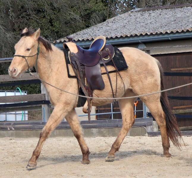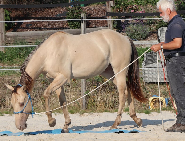 Zeb King Maxen - ein bildhübscher Quarter Horse Wallach, geboren am 2. Mai 2022. Mit seiner seltenen und außergewöhnlichen Farbe Amber Champagne Dun zieht er alle Blicke auf sich. Er wird ein geschätztes Endmaß von ca. 148 cm erreichen und ist kompakt, korrekt gebaut und stabil - mit vielversprechenden Proportionen, die ihn zu einem echten Allroundtalent machen. Zeb ist gesund, genetisch 6-Panel n/n über die Eltern und selbstverständlich altersgemäß geimpft und entwurmt. Er wächst in einer gemischten Herde im Offenstall auf, wo er unter besten Bedingungen viel Ruhe und Sicherheit erfahren durfte. Sein Charakter ist ebenso überzeugend wie sein Exterieur. Der Wallach zeigt sich menschenbezogen, neugierig, nervenstark und entspannt. Gleichzeitig ist er aufmerksam, lernwillig und mutig gegenüber neuen Aufgaben. Zeb ist artig, unkompliziert im Umgang, gut erzogen und lernt schnell - beste Voraussetzungen für eine zuverlässige Partnerschaft auf lange Sicht. Derzeit wird er behutsam und mit viel Gefühl nach den Grundsätzen des Natural Horsemanship auf sein Leben als Reitpferd vorbereitet. Er ist angeritten und zeigt sich dabei sehr brav und gelassen, auch im Gelände. Mit seiner guten Abstammung, seinem tollen Interieur und seiner Vielseitigkeit eignet sich Zeb ideal für Freizeit, Sport oder Turnier. Er ist ein echtes Nachwuchspferd mit Zukunft - ein treuer Partner, auf den man sich verlassen kann.