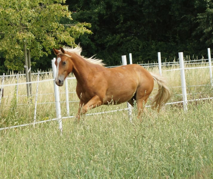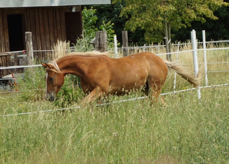 One Shiney Time, also known as Robbie, is a stunning Quarter Horse gelding sired by One Shiney Treat, a direct son of Shining Spark. Robbie’s dam is a daughter of One Time Pepto, making him a fine example of cutting bloodlines. He has correct conformation, with very athletic and cat-like movements. Robbie playfully demonstrates his talent for stops, turns, and lead changes. Currently, he is ridden and shows a very sensitive and refined nature. Sire: One Shiney Treat by Shining Spark / Grays Starlight Dam: Escada Be One Time by One Time Pepto / Shorty Lena As of June 2023, he has passed a 5-panel test (n/n) and IMM (n/n). Our foals grow up in a herd environment with other foals and are regularly dewormed and introduced to the farrier. More information at www.brallentin-quarterhorse.de