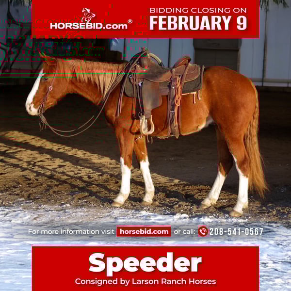 ❤️🔥𝑩𝒆 𝑴𝒊𝒏𝒆 𝐒𝐄𝐋𝐄𝐂𝐓❤️🔥 Happening now thru MONDAY | FEBRUARY 9th - Available EXCLUSIVELY on HorseBid's website! For more details and to register visit: www.Horsebid.com CONSIGNOR CONTACT: Larson Ranch Horses 208-541-0567 LOCATION: St. Anthony, ID BREED: Quarter Horse REGISTERED: No COLOR: Sorrel HEIGHT: 14.3 AGE: 3 GENDER: Gelding Speeder is an exceptional 3 yr old gelding that has as much chrome as he does character. He’s a gentleman with a loving demeanor making him safe for the family to be around. Speeder stands around 14.3-15hh, is easy on the eyes, and a joy to be around. He’s no stranger when it comes to work. On the ranch, he’s been used in many different environments and situations from checking and trailing cows, to shipping pairs, doctoring, or exploring rugged country. He’s one who always aims to please. Speeder knows how to maneuver his way around rocks, logs, brush, bridges, and other obstacles, and does so with confidence and ease. In the arena, Speeder is extremely soft really supple in the face and throughout his whole body, and is a super pretty mover ready for someone to make him their next ranch rider. He carries his lead low, and travels on a loose rein. He wants to ride slow, safe, and balanced. Speeder collects up nicely, picks up his leads has a great stop and is starting to spin. He’s tracked the smarty, and cows in the pasture, as well as has been started ranch roping in the pasture. Speeder has been desensitized to different whips, tarps, noodles, flags, plastic bags, ropes, cars, etc... helping to make him a safe and confident citizen. He’s handsome, and easy to be around. Speeder is extremely user friendly, and has been handled and rode by all levels of riders. His quiet mind, and willingness to please is what sets him apart and makes him the perfect candidate for any soul searching for a life long partner and friend. Whether you’re looking to capture the emotions of the crowd carrying a flag, trail riding with friends, ranching, or looking for your next show horse, Speeder is one who catches the eyes of those around him, and who has the whole package and disposition to get you noticed. References and Testimonials Available Comes with a current and Passed PPE