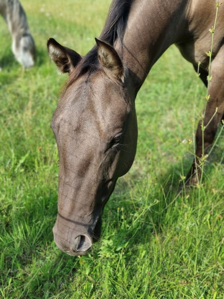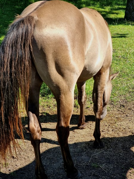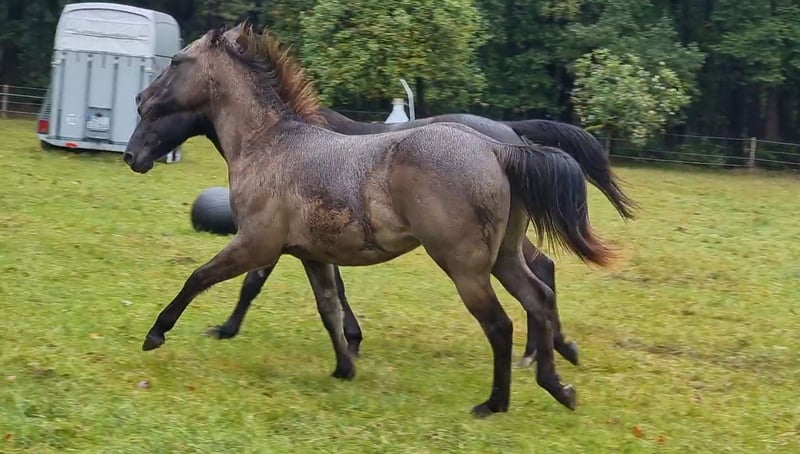 2026 will be your year! You’ve long dreamed of finding your “Perfect Match,” and here it finally is! For sale is this stunning foundation-bred Quarter Horse gelding, “Don Bueno,” also known as “Sharp Steels Dust,” in the special color “Smoky Grullo.” He is a son of IJ Rocky Steeldust (Green Meadow Ranch) and already lives up to his sire’s reputation. Quarter Horse: Gelding, Born: June 2023, Expected height: approximately 15.0 hh, Color: Smoky Grullo (special coat color), Training level: “Ready to start,” Foundation/Reining/Cutting/Allround, 5-panel N/N, DQHA regional eligible to compete. Born and raised on a large pasture, in a species-appropriate environment with an age-mixed herd, alongside other colt foals, and with early handling, “Don” has developed into an exceptionally resilient and calm young horse, carefully prepared with love and attention. From the beginning, he has been able to accompany his mother in everyday life everywhere. He is farrier- and loading-friendly, knows trailer loading, even alone, can be lunged, saddled with a bareback pad and girth, and is familiar with walking out – alone or as a lead horse with his mother. He has been playfully prepared at liberty on the ground, with small lessons in side-passing, backing, stopping, moving forward, bending, parking at the mounting block, crossing wobbles, stepping onto a platform, walking through flutter tapes, puddles, narrow passages, and is familiar with desensitization training, liberty exercises in the round pen, and free-range pasture work. He knows all terrain challenges and much more. Absolutely cool and confident in handling, easy to manage with a solid foundation and good hooves. A brave “strategist” who thinks along and participates. Open-minded and people-oriented – a true cuddle “snugglebug” who loves to be groomed, kissed, and cuddled. As a reliable partner, he will soon calmly and confidently guide you through any trail course, whether at competitions or on a leisure ride. This versatile golden boy is and will be something very special. Don’t wait too long to make your decision – you can’t go wrong here. You still have the chance to train your “best buddy” yourself at this price or decide where to continue his training. Throughout this year, “Don” will get to know the riding hall of Alexander Eck in Lower Saxony, and his price will increase as his training progresses. Due to the discontinuation of horse keeping and riding, we are looking for the “perfect match” for this self-bred “all-round” dream prince in high gloss. PS: His dam, Nitas Sharp Lilly (Smoky Black breeding mare), is also for sale and guarantees foals in Grullo, Smoky Grullo, or Smoky Cream, when paired with IJ Rocky Steeldust!