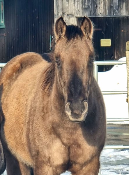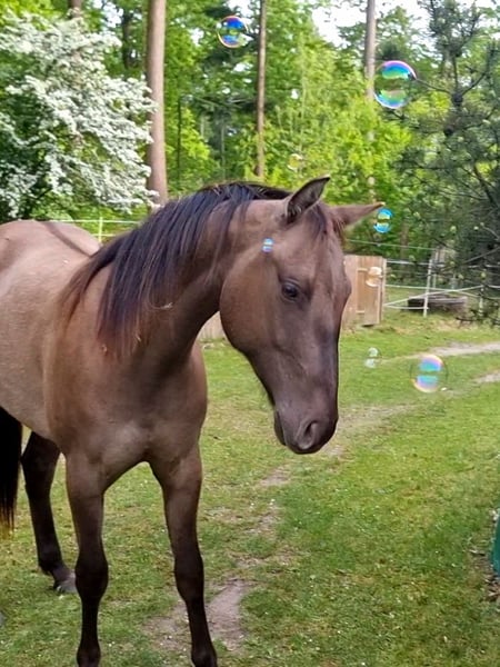 2026 wird Dein Jahr! Du hast lange davon geträumt Dein „Perfect Match“ zu finden und hier ist es endlich! Zum Verkauf steht dieser bildschöne, foundation gezogene Quarterhorse Wallach „Don Bueno“ alias „Sharp Steels Dust“, in Sonderfarbe „Smoky Grullo“. Er ist ein Sohn von IJ Rocky Steeldust (Green Meadow Ranch) und steht seinem Vater schon jetzt in nichts nach. Quarterhorse: Wallach, geboren: Juni 2023, Stockmaß: voraussichtlich 1,50 m, in Sonderlack: Smoky Grullo Ausbildungsstand: "Ready to start" Foundation/Reining/Cutting/Allround 5 Panel N/N DQHA Regio startberechtigt Auf großer Weide geboren und artgerecht aufgewachsen, in altersgemischter Herde, mit anderen Hengstfohlen und frühen Handling haben sich bei „Don“ mehr als ausgezahlt. Das Ergebnis ist ein absolut Immun- und Nervenstarkes, mit sehr viel Liebe und Sorgfalt vorbereitetes Jungpferd in Bestform, dass seine Mutter von Beginn an im Alltag überall hin begleiten durfte. Er ist Schmiede- und Verladefromm, kennt Anhänger fahren, auch alleine, lässt sich longieren, mit Barebackpad satteln und Gurten, er kennt Spazieren gehen – auch alleine und Handpferd reiten mit seiner Mutter. Er wurde am Boden spielerisch schon sehr weit vorbereitet, z.B. mit kleinen Lektionen in Seitengängen, Rückwärts, Anhalten, Fahren, Biegen, Einparken an der Aufstiegshilfe, er geht über die Wippe, aufs Podest, durch Flatterbänder, Pfützen, Engpässe, kennt Anti-Schreck-Training, Liberty-Übungen im Roundpen und frei auf der Weide, kennt sämtliche Herausforderungen im Gelände, uvm. Absolut cool und souverän im Umgang, easy to handle mit einem TOP Fundament und guten Hufen. Ein mutiger "Stratege", der mitdenkt und mitmacht. Aufgeschlossen und Menschenbezogen - ein echter Schmuse-"Schnuffi" der es liebt geputzt, geknutscht und gekuschelt zu werden. Als verlässlicher Partner wird er Dich schon bald ruhig und gelassen durch jeden Trailparcous führen egal ob auf Turnier oder beim Ausritt. Dieser vielseitige golden Boy ist und wird was ganz besonders. Warte nicht zu lange mit Deiner Entscheidung, Du kannst hier absolut nichts falsch machen. Noch kannst Du Dir zu diesem Preis Deinen „Best Buddy“ selbst ausbilden oder entscheiden, wo Du ihn weiter ausbilden lassen möchtest. Im Laufe diesen Jahres wird „Don“ jedoch die Reithalle von Alexander Eck in Niedersachsen kennenlernen und dann steigt der Preis mit voranschreitender Ausbildung. Wegen Aufgabe der Pferdehaltung und des Reitsports suchen wir das „perfect Match“ für diesen selbst gezogenen „Allround“Traumprinzen im Hochglanz-Lack. PS: seine Mutter Nitas Sharp Lilly (Smoky Black a/a Zuchtstute) steht ebenfalls zum Verkauf und ist ein Garant für Grullo, Smoky Grullo oder Smoky Cream Fohlen, bei entsprechender Anpaarung mit IJ Rocky Steeldust!