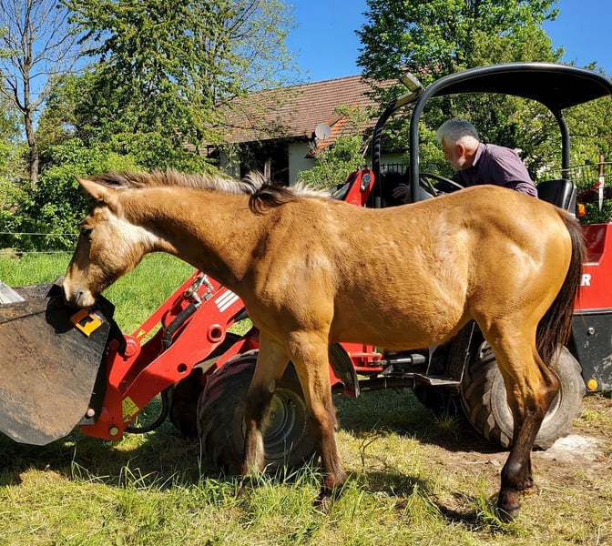 CHIC ist korrekt gebaut und menschenbezogen. Seine väterliche Reinerabstammung wird kombiniert mit Cutting, Reining und Working Cowhorse Qualitäten mütterlicher Seits. Derzeit genießt er das Leben auf einer großen Weide. CHEX ist DQHA & Regionen-Futurity startberechtigt. Er wird von uns behutsam mit den Methoden der Natural Horsemanship auf sein künftiges Leben vorbereitet. Er lässt sich problemlos in den Hänger schicken und beim Schmied steht er ruhig und gelassen.