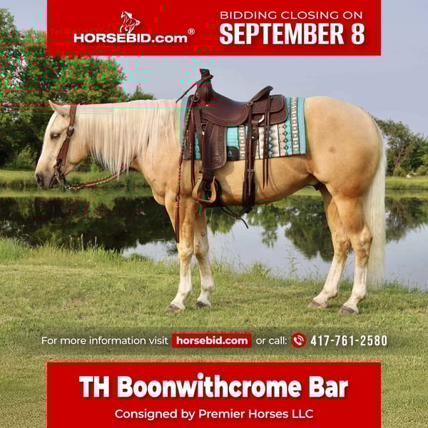 ♦️ 𝐭𝐡𝐞 𝐒𝐞𝐩𝐭𝐞𝐦𝐛𝐞𝐫 𝑺𝒆𝒍𝒆𝒄𝒕 ♦️ Happening now thru MONDAY | SEPTEMBER 8th - Available EXCLUSIVELY on HorseBid's website! For more details and to register visit: www.Horsebid.com CONSIGNOR CONTACT: Premier Horses LLC 417-761-2580 LOCATION: Buffalo, MO BREED: Quarter Horse REGISTERED: Yes REGISTERED NAME: TH Boonwithcrome Bar COLOR: Palomino HEIGHT: 15 AGE: 3 GENDER: Gelding TH Boonwithcrome Bar will absolutely make your mouth water just by looking at him! You do not find many 3 year olds with this much size and athleticism. Not to mention he is a gorgeous golden palomino color with 4 stunning white socks, with a long mane and tail to match! He is picture perfect and built to last. Simba has had a great start and is well on his way to making a fantastic gelding. He has been roping and dragging calves, staying strong to the horn. He is great to ride out in the open and down the trails. Simba is an old soul type with a willing disposition. He goes across the obstacles with ease, through deep or shallow water, traffic safe, and over bridges. Simba has a nice trot and a really smooth lope. He takes his time going down embankments and will briskly go up them with no problems. Simba has started tracking and roping the sled, he would make a fantastic rope horse if taken that direction. He would also excel in the ranch versatility classes too! Simba could truly go in any direction, all the hard work is done, and would be extremely successful. He passed a pre purchase exam and we have current X-rays on file. Do not miss out on this fancy young gelding that could take you far!