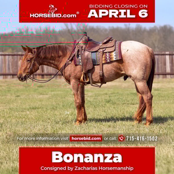 🌟𝑨𝒑𝒓𝒊𝒍 𝐀𝐋𝐋 𝐒𝐓𝐀𝐑 𝐋𝐈𝐍𝐄𝐔𝐏🌟 Happening now thru MONDAY | APRIL 6th - Available EXCLUSIVELY on HorseBid's website! For more details and to register visit: www.Horsebid.com CONSIGNOR CONTACT: Zacharias Horsemanship 715-416-1502 LOCATION: Adair, OK BREED: AQHA REGISTERED: Yes REGISTERED NAME: Cowboys Famous Comet COLOR: Red Roan HEIGHT: 15 AGE: 3 GENDER: Gelding Check out this big, gorgeous, ranchy, red roan gelding! Bonanza is such a nice horse. Amateur friendly and uncomplicated to ride. He's had riders of all levels on him, proving his tolerant and forgiving mind. Easy to catch, gentle on the ground. He has a very smooth, rocking-horse lope, plus a responsive, easy spin, sidepass, stop, back up, and steering. He's willing through transitions at a walk, trot or lope. He's comfortable with a rope and will drag a log or tarp or any other object we've asked him to. Bonanza also is confident handling a gate, carrying a flag, crossing water, etc. Great on the obstacle course and is curious and willing to try new things. And as a cherry on top, he's got the lay down cue and mounting block cue. So, no matter where you are on the trail or at home, you can snap your fingers and he'll sidepass up to the mounting block, fence or tree stump so you can climb on with ease! Ride him saddled or bareback. Bridled or in a halter. Alone or with other horses. Bonanza has done it all. He's also comfortable being stalled or turned out. He's got great manners for the farrier and loves his baths! We've owned bonanza since he was a weanling. We know everything about him. He's always been 100% sound and has really great bone and feet. He's been barefoot his whole life and rides sound across all terrain (including gravel). No buck, no funny business, no vices. He's a solid horse all the way around, and if we had to describe him in one word, it would be “gentleman”. We're proud of Bonanza and are ready to help him find the perfect home. If you have any questions, please call or email us anytime.