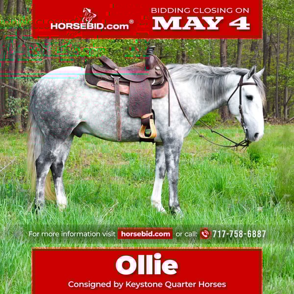 ▪️▫️◾️𝐭𝐡𝐞 𝑴𝒂𝒚 𝐒𝐞𝐥𝐞𝐜𝐭◾️▫️▪️ Happening now thru MONDAY | MAY 4th - Available EXCLUSIVELY on HorseBid's website! For more details and to register visit: www.Horsebid.com CONSIGNOR CONTACT: Keystone Quarter Horses 717-758-6887 LOCATION: Shippensburg, PA BREED: Quarter Horse REGISTERED: No REGISTERED NAME: Ollie COLOR: Dapple Grey HEIGHT: 14 AGE: 4 GENDER: Gelding Meet Ollie, a truly eye-catching 14 hh, 4-year-old dapple grey gelding with a unique look and all the ability you could want in a young horse. With his striking dapple pattern and clean build, he stands out in any setting and is the kind that gets noticed wherever he goes. Ollie is good with cows and shows natural instinct and interest, making him a strong roping and cutting prospect. He’s athletic, quick across the ground, and has the kind of agility and awareness that make him fun to watch and even better to ride. He reads cattle well and is developing the confidence and skill to really excel with the right person to take him further. One of Ollie’s best qualities is his solid “whoa and go.” He has a great stop when you ask, and he’s willing to move out when it’s time to work, giving you that balance of control and responsiveness that makes a horse enjoyable and dependable. He rides soft, stays attentive, and has a willing, trainable mindset that makes him a pleasure to work with. He’s been used on the ranch and has proven himself to be level-headed and capable, handling long days and different tasks without fuss. Ollie takes new situations in stride and keeps a steady attitude, making him a reliable partner whether you’re checking cattle, covering rough ground, or putting in a full day’s work. Out on the trail, Ollie is just as impressive. He is sure-footed, confident, and easy to get along with. He rides out quietly, crosses obstacles without hesitation, and is the kind you can enjoy whether you’re going for a relaxing ride or putting in miles. With his amazing color, natural cow sense, strong foundation, and versatile skill set, Ollie is a standout young gelding with a bright future ahead. He has all the tools to go on in the performance world or continue being a dependable ranch and trail horse. Don’t miss the opportunity to own a young horse with this much potential, ability, and eye appeal.