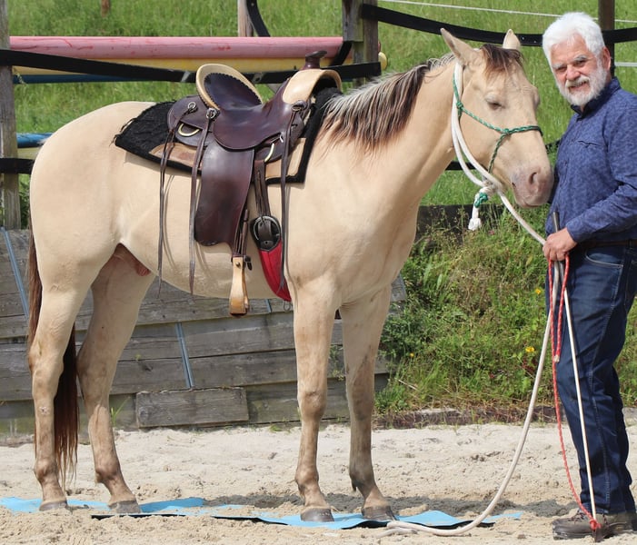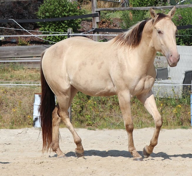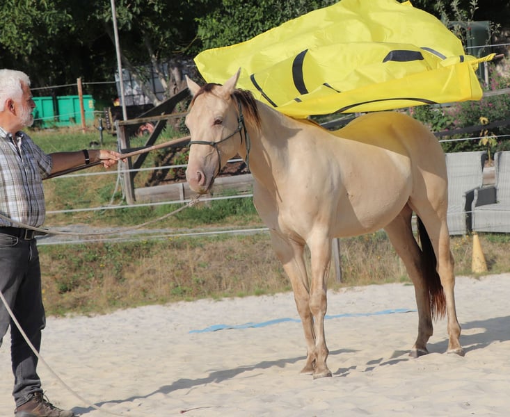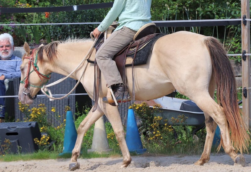 Zeb King Maxen – a stunningly beautiful Quarter Horse gelding, born on May 2, 2022. His rare and extraordinary Amber Champagne Dun color makes him truly eye-catching. He is expected to reach a height of approximately 14.1 hh and is compact, correctly built, and sturdy – with promising proportions that make him a versatile all-rounder. Zeb is healthy, genetically 6-Panel n/n through his parents, and naturally vaccinated and dewormed according to his age. He grew up in a mixed herd in an open stable, where he experienced plenty of calmness and security under optimal conditions. His character is as impressive as his appearance. The gelding is friendly, curious, resilient, and relaxed. At the same time, he is attentive, eager to learn, and brave when facing new challenges. Zeb is well-behaved, easy to handle, well-trained, and learns quickly – ideal prerequisites for a reliable partner for the long term. Currently, he is being gently and thoughtfully prepared for life as a riding horse, following the principles of Natural Horsemanship. He has been backed and shows himself very calm and well-behaved, even in the terrain. With his excellent pedigree, wonderful temperament, and versatility, Zeb is an ideal prospect for leisure riding, sport, or competition. He is a genuine young talent with a bright future – a loyal partner you can rely on.