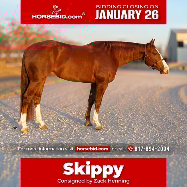 𝐉𝐀𝐍𝐔𝐀𝐑𝐘 ⭐️𝑨𝒍𝒍 𝑺𝒕𝒂𝒓 𝑳𝒊𝒏𝒆𝒖𝒑⭐️ Happening now thru MONDAY | JANUARY 26th - Available EXCLUSIVELY on HorseBid's website! For more details and to register visit: www.Horsebid.com CONSIGNOR CONTACT: Zack Henning 817-894-2004 LOCATION: Weatherford TX BREED: Quarter Horse REGISTERED: Yes REGISTERED NAME: Nonstopp COLOR: Sorrel HEIGHT: 14.3 AGE: 4 GENDER: Gelding Nonstopp also known as “Skippy” is a beautiful 4yo sorrel gelding by one of NCHA’s leading sires Dont Stopp Belevin, out of a money earning Metallic Cat mare. Over the last two years he has been in professional cutting horse training in Weatherford Texas. Skippy has hauled numerous miles, been shown, and quiet. Skippy is 14’3 with plenty of bone. He is a beautiful mover, big stopper, and would excel outside the arena as well. He has had extensive training and is ready to go any desired direction. Contact Zack Henning for any questions.