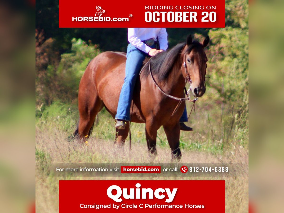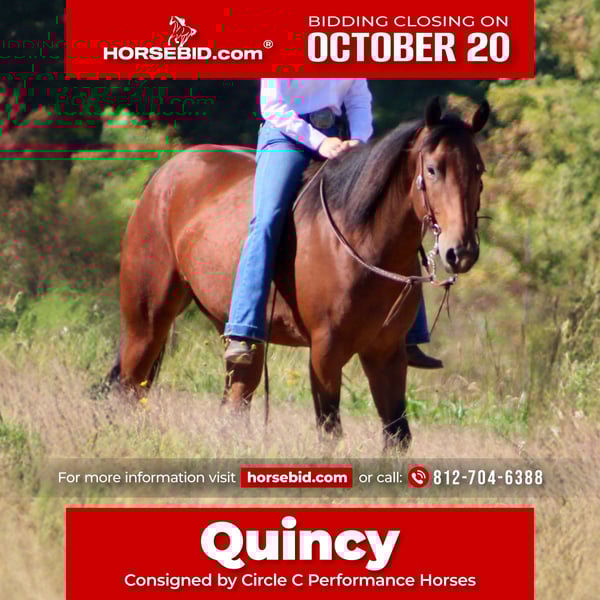 ♦️ 𝐭𝐡𝐞 𝐀𝐌𝐄𝐑𝐈𝐂𝐀𝐍 𝓕𝓪𝓵𝓵 𝓒𝓵𝓪𝓼𝓼𝓲𝓬 ♦️ Happening now thru MONDAY | OCTOBER 20th - Available EXCLUSIVELY on HorseBid's website! For more details and to register visit: www.Horsebid.com CONSIGNOR CONTACT: Circle C Performance Horses 812-704-6388 LOCATION: Borden, IN BREED: AQHA REGISTERED: Yes REGISTERED NAME: CHAINYS SIR QUINCY COLOR: Bay HEIGHT: 14.3 AGE: 3 GENDER: Gelding Chainys Sir Quincy 2022 Bay AQHA Gelding Here’s a 3-year-old gelding with the mind, look, and foundation to go any direction. Quincy is level-headed, smart, and eager to please. He’s already been lightly shown in Ranch Riding Rail classes, started correctly, and never pushed. This young gelding has the temperament to suit a youth or amateur, yet the ability to step up for a serious competitor. He rides quiet, works off leg pressure, carries a natural headset, and stays collected at all gaits. Quincy has been exposed to trail obstacles, cattle, and even gunfire. He’s soft, willing, and rides just as well outside the arena as he does inside. Quincy has been ridden extensively outside the arena on trails and during ranch work. He confidently handles all types of terrain, going up and down steep hills with ease, and has been on multiple overnight camping trips where he stands tied quietly to hitching rails. As talented as he is in the show pen, he’s equally at home on the ranch—used for checking pastures and fences, sorting cattle, and opening gates with ease. He’s the kind that can work during the week, then go show or enjoy a relaxing trail ride on the weekend. Quincy is very well mannered and stands great for grooming, tacking, and the farrier. He stalls well, goes out in a mixed herd, and gets along with other horses. 100% sound, maintenance-free, and ready to continue his versatile career wherever you point him.