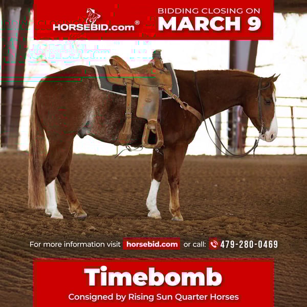 ℳ𝒶𝓇𝒸𝒽 ♦️𝐑𝐈𝐃𝐄𝐑'𝐒 𝐂𝐇𝐎𝐈𝐂𝐄♦️ Happening now thru MONDAY | MARCH 9th - Available EXCLUSIVELY on HorseBid's website! For more details and to register visit: www.Horsebid.com CONSIGNOR CONTACT: Rising Sun Quarter Horses 479-280-0469 LOCATION: Morrilton, AR BREED: AQHA REGISTERED: Yes REGISTERED NAME: Shiney Hickory Time COLOR: Red Roan HEIGHT: 14.3 AGE: 4 GENDER: Gelding This 5-year-old sorrel gelding is the total package—young, talented, and broke the right way. He’s got a solid foundation with a good handle, making him confident and responsive both in and out of the arena. He lopes off smooth, moves willingly off leg pressure, and has a big, correct stop. He’ll spin both left and right with ease and control, staying balanced and collected. He has good ground manners and stands tied quietly for grooming, saddling, and the farrier. He’s respectful, easy to be around, and handles new environments like a gentleman. He carries a strong, proven pedigree that adds value and potential for performance. With his combination of talent, disposition, and breeding, this gelding is a standout prospect with a bright future ahead.