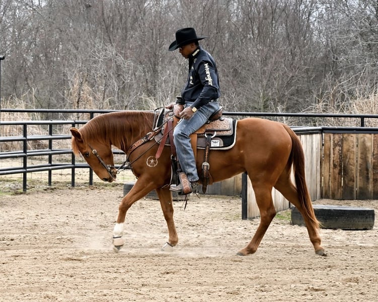 Denny, potro de 4 años, de 15 manos, color alazán, de raza AQHA, y yeguarizo.