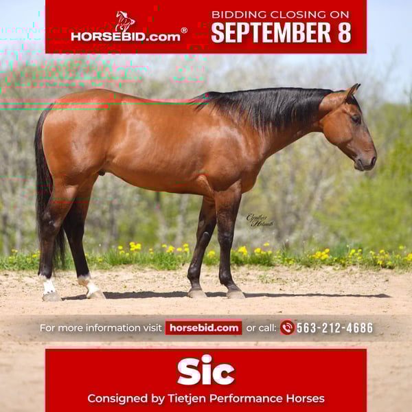 ♦️ 𝐭𝐡𝐞 𝐒𝐞𝐩𝐭𝐞𝐦𝐛𝐞𝐫 𝑺𝒆𝒍𝒆𝒄𝒕 ♦️ Happening now thru MONDAY | SEPTEMBER 8th - Available EXCLUSIVELY on HorseBid's website! For more details and to register visit: www.Horsebid.com CONSIGNOR CONTACT: Tietjen Performance Horses 563-212-4686 LOCATION: Bellevue, IA BREED: Quarter Horse REGISTERED: Yes REGISTERED NAME: This Sic Beat *𝓞𝔀𝓷 𝓢𝓸𝓷 𝓸𝓯 𝓐 𝓥𝓲𝓷𝓽𝓪𝓰𝓮 𝓢𝓶𝓸𝓴𝓮* COLOR: Dun HEIGHT: 15 AGE: 4 GENDER: Gelding Meet This Sic Beat, a stunning 15hh, 4-year-old dun gelding. We call him Sic around the barn, and he has earned a spot as our favorite with his easy, willing disposition and a calm demeanor that makes him a true joy to be around. Sic's talent is no accident. He is an own son of the legendary A Vintage Smoke, a stallion with a LTE of over $600,000. A Vintage Smoke is a true reining icon, holding titles as the NRHA Open Futurity Champion and the prestigious NRHA Triple Crown Winner. Sic carries this incredible legacy in his blood, inheriting the athletic ability and trainability that define his sire's offspring. If you're looking for a horse that is as talented as he is kind, Sic is your guy. He's the kind of horse that makes a hard day easy and a good day great. His quiet, calm nature and willingness to please make him an ideal partner for almost any rider, from an amateur looking to compete to a rider just wanting to hit the trails. Sic is truly a horse that does it all. We've used him to trail ride through a wide variety of terrain, gather and move cattle on our property, and even as a lesson horse for a diverse range of riders. His solid foundation and eager-to-learn attitude make him a versatile prospect with a bright future. We recently hauled him to his first-ever ARHA show, and he handled the trip and the new environment like a horse twice his age, settling in with ease. In his debut, he earned impressive placings, including 7th in Ranch Trail, 4th in Ranch Boxing, 9th in Working Ranch Horse, and 9th in Ranch Confirmation. He also rides bridleless, showcasing his trust and responsiveness, and would make a great rope horse prospect. At just four years old, Sic is ready to go in any direction. Whether you're dreaming of a career in Ranch Riding, Ranch Trail, or as a versatile partner for the family, he has the natural athleticism and good mind to excel. This is more than just a horse for sale; it's an opportunity to own a barn favorite with the heart of a champion. Sic is ready to find his forever home and become your next great partner. Give Terry & Kate, 563-212-4686, a call to meet This Sic Beat and see for yourself why he's so special.