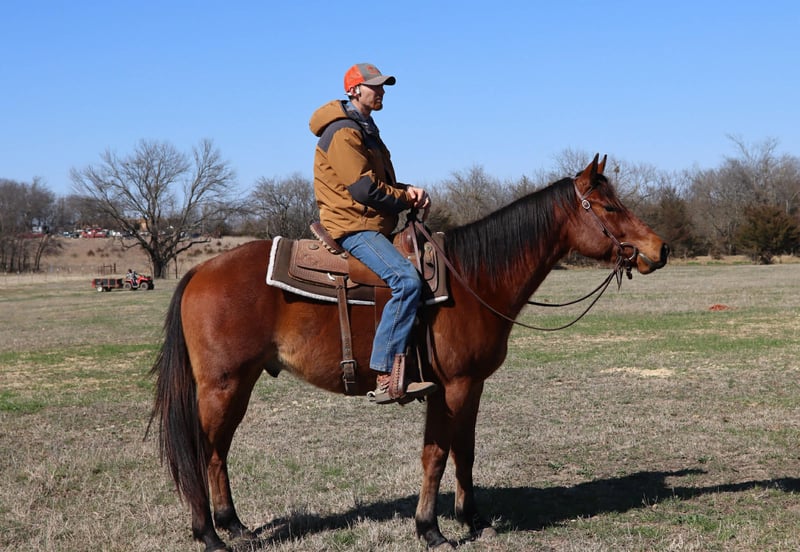 "AVAILABLE ON ONLINE HORSE AUCTION AT www DOT PlatinumEquineAuction DOT com BIDDING OPEN NOW thru SUNDAY | MARCH 8TH! *Final price will be determined on auction site* CONSIGNOR CONTACT INFO: Marco Roux Performance Horses 918-910-1197 LOCATION: Holdenville, OK Bay Roan gelding 3 coming 4 year old standing 15 hands high should mature to 5.2 hands This gelding has a solid foundation and has been started right with a great personality that wants to please this horse will make someone an awesome ranch/trail/or rope horse. He has roped the sled,worked at the sale barn ,sorted cattle on the ranch ,been on trail rides and really a great all around horse ready for a job . Stands tied ,loads easy , stands for farrier, good in the wash bay .