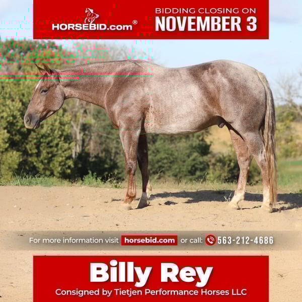 ⚜️𝐓𝐇𝐄 𝐅𝐀𝐋𝐋 𝐇𝐄𝐑𝐈𝐓𝐀𝐆𝐄 𝐂𝐋𝐀𝐒𝐒𝐈𝐂⚜️ Happening now thru MONDAY | NOVEMBER 3rd - Available EXCLUSIVELY on HorseBid's website! For more details and to register visit: www.Horsebid.com CONSIGNOR CONTACT: Tietjen Performance Horses LLC 563-212-4686 LOCATION: Bellevue, IA BREED: AQHA REGISTERED: Yes REGISTERED NAME: Stevie Blues COLOR: Red Roan HEIGHT: 15 AGE: 4 GENDER: Gelding Do you own a Stevie? If not, you should! Everybody loves a Stevie and here is your chance to get a NCHA Money Earner of your own! Don’t miss out on this truly One-of-a-Kind gelding. Stevie Blues aka Billy Rey is a stunning 2021 red roan gelding that stands just under 15hh. If you’re in search of an outstanding cutting horse that will put checks in your pocket, take a look at Stevie Blues. This stand-out gelding will win at the cutting, take you down the trail, handle your ranch work or just brighten your day. Billy Rey is a joy to be around on the ground as well as in the saddle. He stays broke day after day, whether you ride every day or once a week. He is very easy to haul and show, good enough for the open, but gentle enough for a non-pro or amateur. Billy Rey’s looks will definitely turn heads and get your attention. His personality will win your heart. Billy Rey may only be a 4-year-old but he has been in good hands his whole life. His training started with Morgan Cromer, one of the best! With 2 years of professional cutting training, he has an exceptional handle. He stays light in the bridle and moves off your leg easily. He has a lot of cow and stays hooked. He is quick-footed, but a very smooth mover, that just takes you with him. Billy Rey’s athletic ability, trainability and disposition are not accidental. One look at his pedigree and you’ll know why! His sire is the ONE and ONLY Stevie Rey Von-with LTE $420,903 and PE $20,548,373. He is the only living stallion in NCHA Open Futurity history to be an NCHA Open Futurity Champion, sired by an NCHA Open Futurity Champion and to have sired an NCHA Open Futurity Champion. His dam is This Kittys Smart-LTE $113,855, producer of money earners and an own daughter of WR This Cats Smart-LTE $263,514 and PE over $20 million. Billy Rey is currently in cutting training and being hauled and shown in the open. I believe he would also be successful in the non-pro or amateur. I don’t feel like he needs to be in a professional cutting program, but we would be happy to keep him in our program and help the new owner achieve success in the show pen. Billy Rey is 100% sound with no maintenance and x-rays available upon request. If you have any questions or would like to come meet and ride Billy Rey, please contact Terry (563)543-2248 or Kate (563)212-4686 with Tietjen Performance Horses.