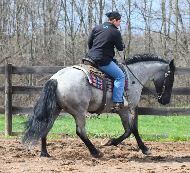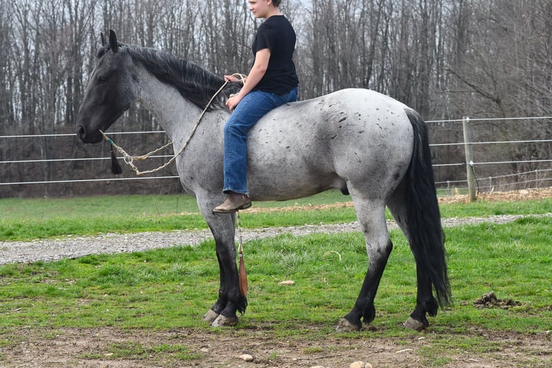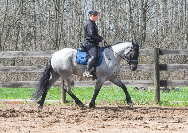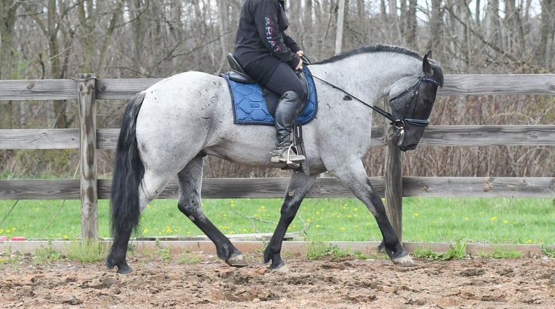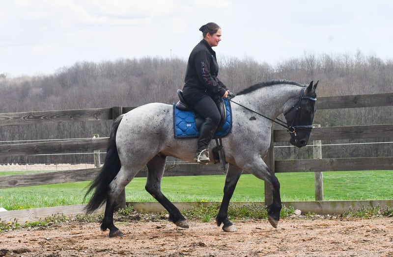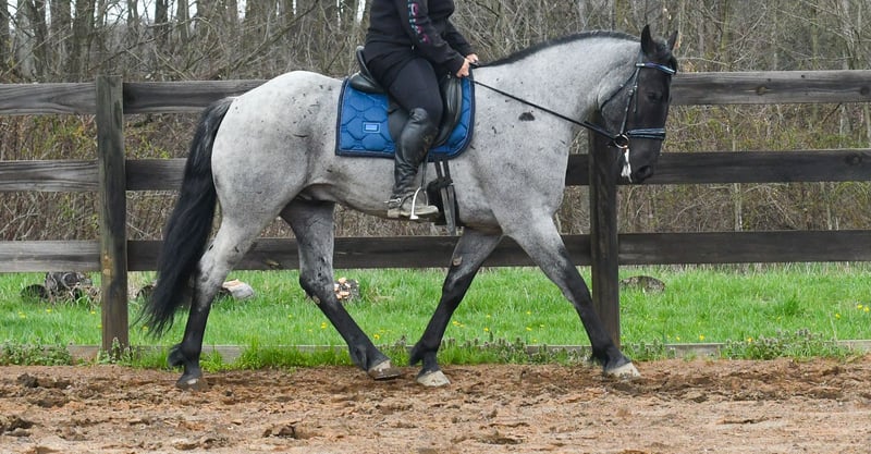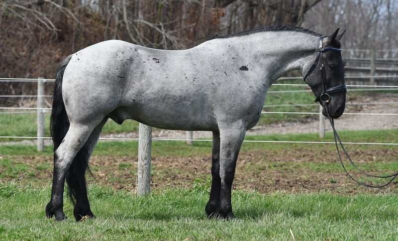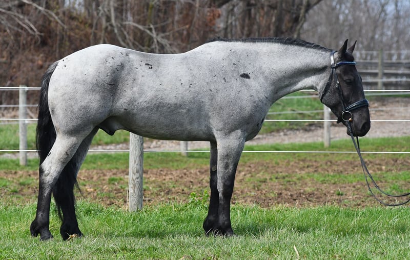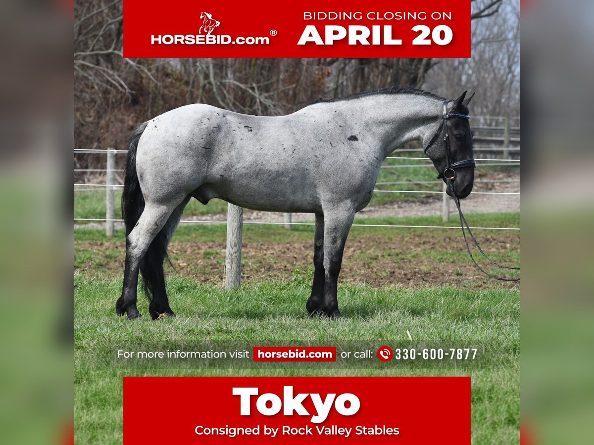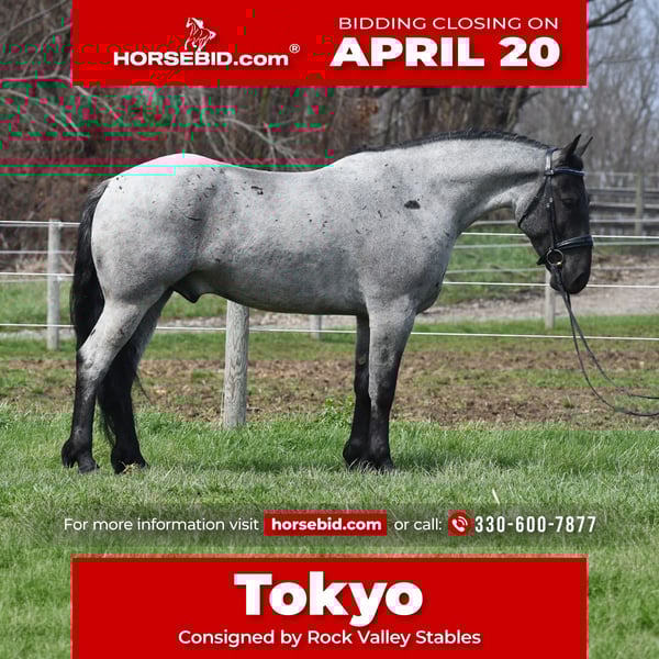 ⚜️𝐭𝐡𝐞 𝓔𝓵𝓲𝓽𝓮 𝐒𝐩𝐫𝐢𝐧𝐠 𝐂𝐥𝐚𝐬𝐬𝐢𝐜⚜️ Happening now thru MONDAY | APRIL 20th - Available EXCLUSIVELY on HorseBid's website! For more details and to register visit: www.Horsebid.com CONSIGNOR CONTACT: Rock Valley Stables 330-600-7877 LOCATION: Strasburg, OH BREED: Quarter Horse/Friesian Cross REGISTERED: No REGISTERED NAME: Tokyo COLOR: Blue Roan HEIGHT: 15 AGE: 4 GENDER: Gelding Tokyo is a wonderful, gentle soul, with great conformation, fancy blue roan coloring, and the prettiest black head. This guy is extremely versatile. He is experienced out on the trail, with things like steep hills, logs, dogs tagging along, and creeks. He will happily walk on a relaxed, loose rein alone, or in a group. No worries if you have to travel down the road a bit to get to the trail, he is fine with that too. In the arena, you can ride him in western tack, on a loose rein. He neck-reins, and moves off leg pressure very well. He has a lovely pivot in either direction, side-passes, and backs. He picks up either lead with ease, all it takes is a kiss and bump with your outside leg. He also has the slow, smooth jog that is a pleasure to sit and ride. He stands at nicely at mounting block while mounting, and walks off quietly after time-off. Tokyo also has dressage training, if that is more your cup of tea. He would be ready to show training level, and is schooling first level. He is nice in the contact, leg yields, and is schooling the shoulder in. We have started to play around with walk to canter transitions. Tokyo loads and trailers well, and rides well off-property in a new environment. He doesn't mind the ball or tarp. We had him over obstacles, and he is cool and confident. He can also be ridden bareback! If you want to put on a special show, he will lay down and sit up for you from the ground or in the saddle. In the barn, he has a friendly, in your pocket personality. He will stand quietly in cross ties without complaint. He is safe to allow kids to help with the grooming, and is used to our dogs running underfoot. Tokyo leads politely, and respects your space. He bathes nicely, and is good for the vet. He will stand for the farrier in cross ties, and shoes very well. He has no history of lameness or illness, and sells 100% sound.