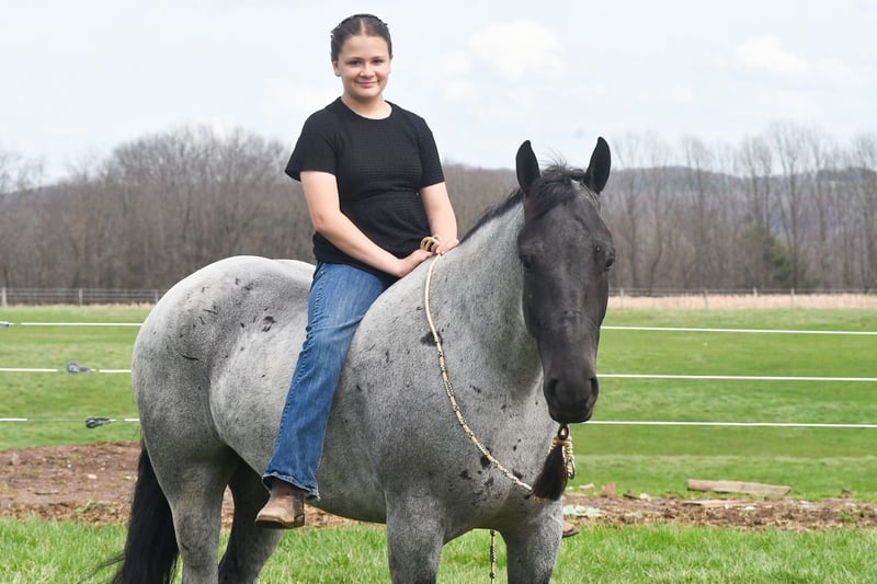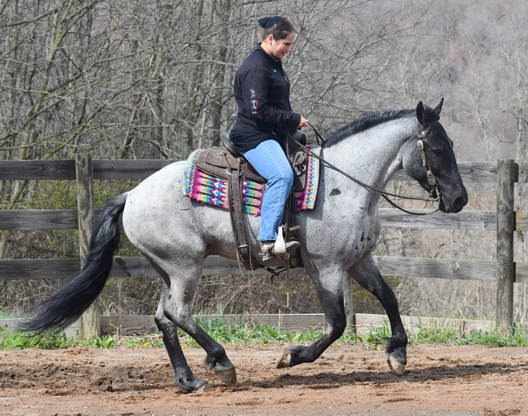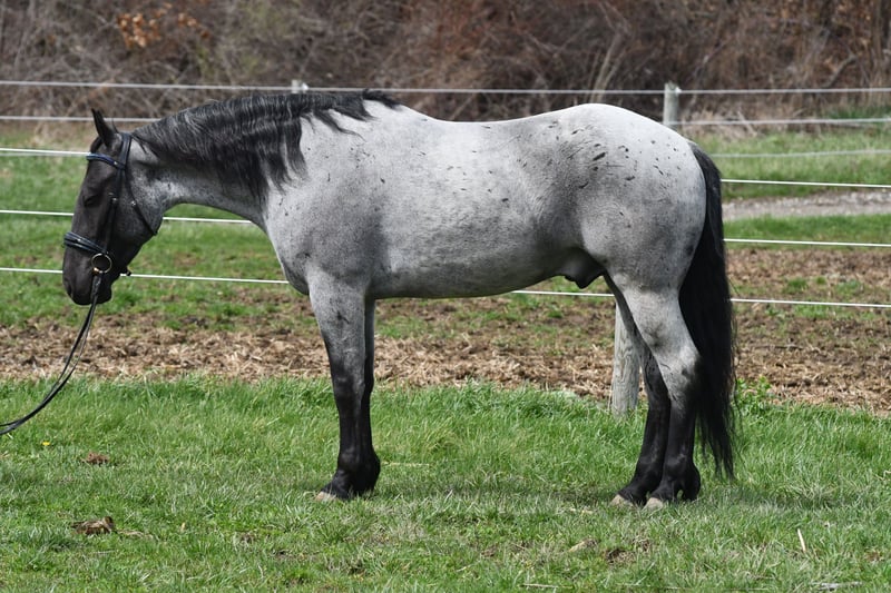 Tokyo, potro de 4 años, 1,55 m, mezcla de QH y Frisón, color roano azul, castrado