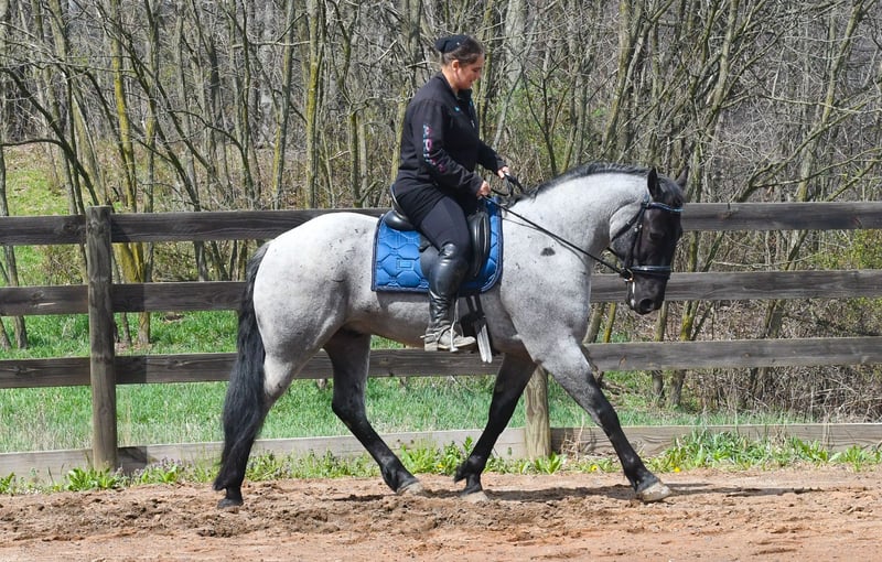 ⚜️The Elite Spring Classic⚜️ läuft jetzt bis MONTAG | 20. April – exklusiv auf der Website von HorseBid verfügbar! Weitere Details und Anmeldung unter: www.Horsebid.com VERKÄUFERKONTAKT: Rock Valley Stables 330-600-7877 STANDORT: Strasburg, Ohio RASSE: Quarter Horse / Friesian Cross ANGEMELDET: Nein NAME: Tokyo FARBE: Blue Roan GRÖSSE: ca. 15 Hand ALTER: 4 Jahre Geschlecht: Wallach Tokyo ist ein wundervoller, sanfter Charakter mit ausgezeichneter Konformation, auffälliger Blue Roan-Färbung und einem hübschen schwarzen Kopf. Dieser Wallach ist äußerst vielseitig. Er ist erfahren auf Trails, bewältigt steile Hänge, Baumstämme, Hundegesellschaft und Bäche problemlos. Er geht gerne entspannt und locker im Gelände, allein oder in der Gruppe. Kein Problem, wenn die Anfahrt zum Trail etwas länger ist – auch das meistert er gut. Im Reitplatz kann man ihn im Westernsattel auf lockerer Zügelführung reiten. Er neck-reitet, reagiert sehr gut auf Schenkel und bewegt sich feinfühlig auf Druck. Er macht schöne Wendungen, Seitengänge und Rückwärtsrichten. Er nimmt beide Führungen mühelos auf, einfach Kuss und Druck mit dem äußeren Schenkel genügen. Zudem hat er einen ruhigen, flüssigen Jog, der angenehm zu sitzen ist. Beim Aufsteigen steht er ruhig am Aufstiegshilfe, und nach längerer Pause geht er leise los. Tokyo ist auch dressurmäßig ausgebildet, falls das eher Ihr Ding ist. Er ist bereit für die Ausbildung auf Turnierniveau und arbeitet an der ersten Stufe. Er ist gut im Kontakt, arbeitet an Leg-yields und am Schulter-in. Wir haben bereits mit Übergängen vom Schritt zum Canter begonnen. Er lädt problemlos in den Trailer und fährt auch in ungewohnter Umgebung gut mit. Er hat keine Angst vor Bällen oder Planen. Wir haben ihn über Hindernisse geführt, er ist ruhig und selbstbewusst. Er kann auch barfuß geritten werden! Für besondere Shows legt er sich auf Wunsch auch ab und setzt sich vom Boden oder im Sattel wieder auf. Im Stall zeigt er eine freundliche, anhängliche Persönlichkeit. Er steht ruhig in den Kreuzstricken ohne Murren. Er ist sicher im Umgang, Kinder können beim Putzen helfen, und er ist an unsere Hunde gewöhnt, die unter den Beinen hindurchlaufen. Tokyo führt höflich und achtet auf den Abstand. Er lässt sich gut baden und ist beim Tierarzt ruhig. Beim Hufschmied steht er brav in den Kreuzstricken und bekommt sehr gute Hufe. Er hat keine Anzeichen von Lahmheit oder Krankheiten und ist 100 % gesund im Verkauf.