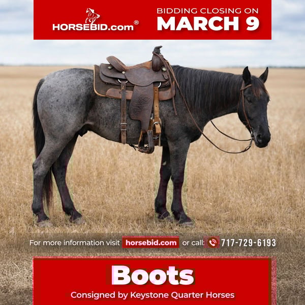 ℳ𝒶𝓇𝒸𝒽 ♦️𝐑𝐈𝐃𝐄𝐑'𝐒 𝐂𝐇𝐎𝐈𝐂𝐄♦️ Happening now thru MONDAY | MARCH 9th - Available EXCLUSIVELY on HorseBid's website! For more details and to register visit: www.Horsebid.com CONSIGNOR CONTACT: Keystone Quarter Horses 717-729-6193 LOCATION: McConnellsburg, PA BREED: Quarter Horse REGISTERED: Yes REGISTERED NAME: RW Blu Boots COLOR: Blue Roan HEIGHT: 15.1 AGE: 4 GENDER: Gelding Boots is a 4-year-old blue roan registered gelding standing 15.1 hands, and he’s the kind of well-built, eye-catching horse a family can truly enjoy. He has a strong, balanced frame with good bone and athletic ability, plus plenty of years ahead of him to continue developing with his next owners. With Hancock breeding behind him, he carries the kind of foundation that’s known for producing durable, hardworking ranch horses with good minds. Boots has proven to be a dependable and enjoyable trail horse. He rides out confidently, handles different terrain with ease, and keeps a steady, easygoing attitude. Whether you’re checking fences, riding through town, or heading out for a relaxing afternoon on the trails, he’s the type you can saddle up and feel good about. He’s willing, kind, and pleasant to be around both on the ground and under saddle. He would make an excellent ranch horse, trail horse, rope horse prospect, or all-around rodeo mount. Boots has the athleticism to go to work and the temperament to fit into a family setting. He’s suitable for kids and beginners, yet responsive and capable enough for an experienced rider who wants to continue advancing him. If you’re looking for a versatile, good-minded blue roan gelding with a bright future, Boots is ready to be your next partner.