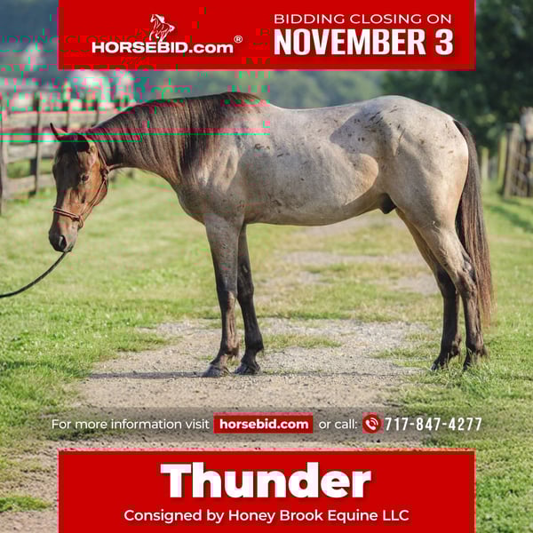 ⚜️𝐓𝐇𝐄 𝐅𝐀𝐋𝐋 𝐇𝐄𝐑𝐈𝐓𝐀𝐆𝐄 𝐂𝐋𝐀𝐒𝐒𝐈𝐂⚜️ Happening now thru MONDAY | NOVEMBER 3rd - Available EXCLUSIVELY on HorseBid's website! For more details and to register visit: www.Horsebid.com CONSIGNOR CONTACT: Honey Brook Equine LLC 717-847-4277 LOCATION: Honey Brook, PA BREED: Quarter horse/ Friesian cross REGISTERED: No COLOR: Strawberry Roan HEIGHT: 15.2 AGE: 3 GENDER: Gelding Thunder is a 3 yr old 1/2 quarter horse 1/4 Friesian 1/4 Standardbred gelding looking for his forever home,, he's got lots of personality and will look at you as his best friend, he'll meet you at the gate, and if you don't watch it he'll follow you around all day like a dog!!.. In the ring he's lot's of fun and is willing to please you, he's soft off of seat and leg cues, knows how to sidepass, and can turn on the forehand or on the haunches, which makes him very handy... he'll open and close gates and wait on you while you get it latched, he's got a balanced walk,trot and canter and is just tons of fun!! also Thunder has been introduced to obstacles and is very willing to cross whatever you point him at, he's used to flags,tarps,ropes..he will standing while you practice your roping and if you can catch,he can drag! Thunder will go English or western and also has some schooling on dressage.. Thunder is also a comfortable steady trail horse, and he'll cross creeks,logs,bridges or whatever comes in your way,he loves going exploring and he'll also lead your colt or mules along with you,, he sells 100 percent sound,, PPE welcome at buyers expense, contact us for more information..