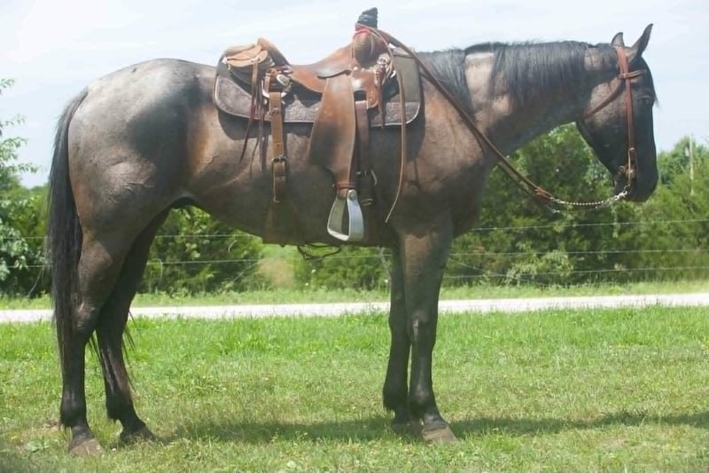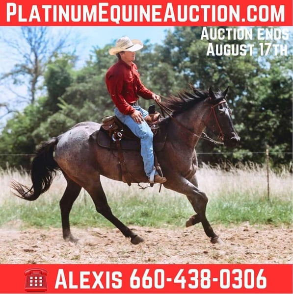 ONLINE AUCTION Place your bids at www.PlatinumEquineAuction.com Starting Bid $3500 Auction ends August 17th, 2025 Need a new saddle? Check out White Rock Saddles on our website or Facebook ONLINE AUCTION Place your bids at www.PlatinumEquineAuction.com Starting Bid $3500 Auction ends August 17th, 2025 Need a new saddle? Check out White Rock Saddles on our website or Facebook Meet Blue – a 3-year-old registered blue roan gelding with a heart as big as his personality. Standing 15:2 hands. Blue is the total package: kind, good-minded, and built to go in any direction. From the moment you step into the pasture, Blue is the first to greet you at the gate. He’s an in-your-pocket kind of horse who loves people and always comes looking for attention. Whether you’re brushing him, saddling up, or just hanging out, he’s happy to be by your side. ✅ Temperament: Gentle, gentle, gentle. Blue has one of the sweetest, calmest dispositions you’ll find in a young gelding. He’s handled daily and takes everything in stride, making him a pleasure to be around both on the ground and under saddle. ✅ Training: Blue has a great start under saddle and is coming along beautifully. He walks, trots, and lopes circles with ease, is soft in the face and ribs, and responds well to leg pressure. He has all the right buttons coming together — balanced, willing, and eager to please. ✅ Experience: He’s been used in the sale barns and for gathering cattle, showing maturity well beyond his years. Nothing seems to rattle him — he handles noise, movement, and pressure like a seasoned pro. 💙 This is a gelding with a solid foundation, a kind soul, and the potential to go in any direction — ranch work, trail riding, family horse, or future performance prospect. He’s got the mind, looks, and start to be something really special. 📌 Age: 3 years old 📌 Color: Blue Roan 📌 Registered: Yes 📌 Discipline: Started Ranch/Trail Prospect 📌 Disposition: Friendly, Gentle, People-Loving Don’t miss your chance to own a young gelding with this kind of foundation and personality. Blue is ready to finish your way — and he’ll enjoy every minute of the ride right alongside you. For more info call AM Equine Alexis 660-438-0306 with any questions. Located in Cole Camp, MO. ONLINE AUCTION Place your bids at www.PlatinumEquineAuction.com Starting Bid $3500 Auction ends August 17th, 2025 Need a new saddle? Check out White Rock Saddles on our website or Facebook