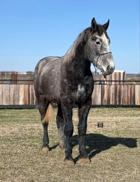 ONLINE AUCTION Place your bids at www.PlatinumEquineAuction.com Starting Bid $3500 Auction ends March 2nd, 2025 Need a new saddle? Check out White Rock Saddles on our website or Facebook! Blue is a 3 year old Draft Cross gelding standing 16.3 hands with all the dapples you could ask for. He is the kindest eyed and old soul type that is very gentle and laid back. Blue has never hesitated to do anything we have asked of him and is amazing to ride out on the ranch and down the trails. He is broke to drive and traffic safe. Blue is soft in the face and has some collection, a nice stop, and moves off leg well. We think he would make an awesome fox hunter if you wanted to go that route! He hauls well to new places and will go out alone with confidence or cruise in a group. We have checked cows on him, he loves the water, and can climb up and down absolutely any terrain. While Blue is young, he has the true draft demeanor of being born broke and gentle. He has never offered any funny business and has great manners. We believe Blue could fit just about anyone and any program. He is sound and UTD. FMI call/text Holland Horse Co. Chanel 559-978-6320. We can help arrange shipping nationwide from Jacksboro, TX. ONLINE AUCTION Place your bids at www.PlatinumEquineAuction.com Starting Bid $3500 Auction ends March 2nd, 2025 Need a new saddle? Check out White Rock Saddles on our website or Facebook!