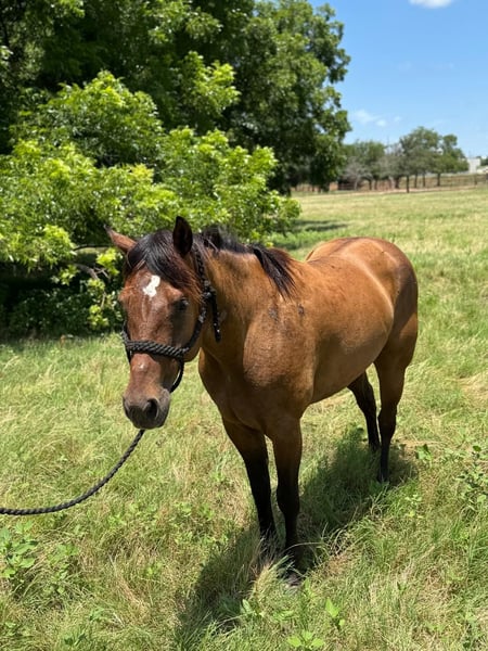 "AVAILABLE ON ONLINE HORSE AUCTION AT www DOT MagicHorseAuction DOT com BIDDING OPEN NOW thru TUESDAY | JULY 8th - BUY IT NOW AVAILABLE! *Final price will be determined on auction site* CONSIGNOR CONTACT INFO: Dustin Jackson 940-631-5245 LOCATION: Henrietta, TX 15.2, 4 year old Bay Gelding by Mechanic - (AQHA WORLD CHAMPION - HIGH POINT PLEASURE STALLION and Top 10 AQHA World Champion Reserve Congress Champion High Point Western Pleasure Stallion in the Nation). In the barn, his name is Tyrone. Tyrone had a late start to his training but is catching up quickly. With only 75 days training, he is showing all the athleticism needed to make an outstanding trail horse and could easily go on with his training and go to the show pen. He has pulled logs and tires around and could be used as a ranch horse. He has the size and the bone to go with it. He is laid back and has a good demeanor. He stands to be tied and picks up all feet. He is super easy to catch and loves a good scratch. He is 100% Sound! This gelding will make someone a great horse in the future. he has a great start to go any direction that you wanted to. Located in Henrietta, TX.