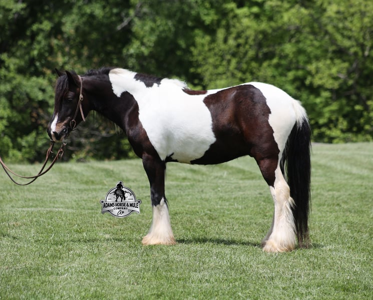 Meet Domino! This fancy looking Black Tobiano Gypsy Cross Gelding stands 14H and he is stocky built, he is 4 years old but its wise beyond his years! Domino has completed the natural horsemanship program and he is very friendly and loves attention!! He knows some tricks as well as he will lay down. Domino has done it all from being ridden by small children down the highways to being ridden around the ranch, pasture roped cows, rode fences and cruised the trails. Domino is confident out riding alone and does fine in groups. When out on the ranch or going down the trails he will cross creeks, ditches, logs and navigate rough, rocky areas. He is safe in traffic safe whether that be trucks or cars. He walks out easily, has a nice jog, his lope is slow and collected plus he lopes very nice circles! He has been exposed to all kinds of wildlife such as deer or turkey. He is athletic and would be a great horse to put under English tack to go over the rails with. He pastures well with others and rides the same after time off. Domino is a fun horse to ride and is sure to be everyone’s favorite! Feel free to call Eric 606-308-2461 with any questions! Go to visit our website for more pics and a video www.AdamsHorseAndMuleCo.com AHAMC has been in the horse business and sold horses over the internet since 2005. We have a long track record of success with hundreds of happy customers. We work hard to match riders with the correct horses and specialize in beginner safe, family friendly horses that have been used and checked out by our family! We can set up transportation anywhere in the US and look forward to working with you.
