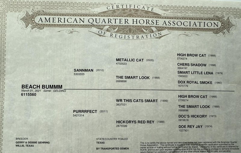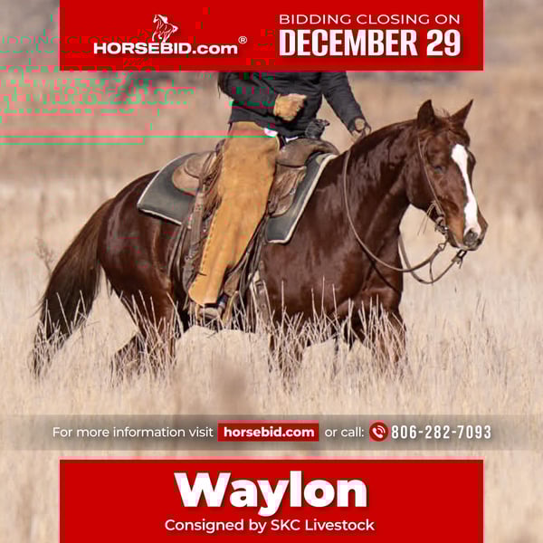 ⚜️ 𝓗𝓮𝓻𝓲𝓽𝓪𝓰𝓮 𝐖𝐢𝐧𝐭𝐞𝐫 𝓒𝓵𝓪𝓼𝓼𝓲𝓬⚜️ Happening now thru MONDAY | DECEMBER 29th - Available EXCLUSIVELY on HorseBid's website! For more details and to register visit: www.Horsebid.com CONSIGNOR CONTACT: SKC Livestock 806-282-7093 LOCATION: Canyon, TX BREED: Quarter REGISTERED: Yes REGISTERED NAME: Beach Bummm * Sired by Sannman COLOR: Sorrel HEIGHT: 14.1 AGE: 4 GENDER: Gelding Beach Bumm (aka “Waylon”) is a 14.1-hand sorrel gelding that is the definition of handy, gentle, and talented. He is super-duper broke, quiet minded, and incredibly safe—the kind you can trust every day, no matter the job. He has been roped on by youth, ranched on by youth, and is very capable when it comes time to sorting and taking care of cattle. Waylon reads a cow naturally, stays soft and responsive, and is handy enough to make any job easier—whether you’re opening gates, dragging calves, or stepping into the sorting pen. Waylon is awesome to rope on and has the kind of foundation that leaves the door wide open for him to finish into a wonderful breakaway horse or junior rodeo horse, suitable for any level of youth. He stays calm, honest, and forgiving, making him a great confidence builder both in and out of the arena. He is also excellent to ride outside. He crosses water willingly, is confident and safe, and is sure-footed in rocky country, making him just as enjoyable on the trail or ranch as he is in the arena. He has a huge heart, gobs of try, and truly doesn’t know what quit is. He shows up every day ready to work, stays willing and honest, and always gives his rider his best. Waylon is royally bred and eligible for the Gold Buckle. He is sired by Sannman, earner of $200,847 and producer of over $4,025,730, and out of “Purrrfect,” a mare that earned over $67,000, giving him a pedigree that matches his talent and mind. He is super sound, solid in every way, and stays consistent even with time off. Easy to saddle, easy to ride, and always willing, he has a big personality that makes him fun to be around and a favorite in the barn. To top it all off, he’s very cute, well-made, and the perfect size to get on and off all day long. A truly nice, honest gelding that combines gentleness, talent, pedigree, heart, and real-world usefulness—the kind everyone is always looking for.