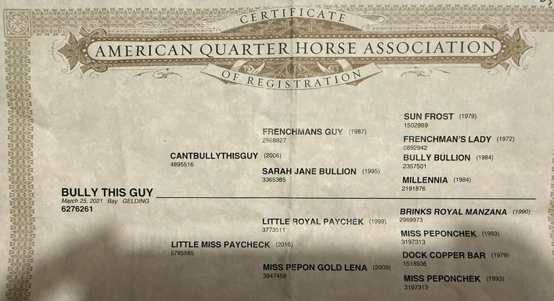 ONLINE AUCTION Place your bids at www.PlatinumEquineAuction.com Starting Bid $3500 Auction ends September 14th, 2025 Need a new saddle? Check out White Rock Saddles on our website or Facebook If you’re looking for a dependable, versatile, and people-loving gelding, Peanut is your guy! “Bully This Guy” is a 2021 AQHA-registered gelding who stands 14.1 hands and packs a ton of talent and heart into a compact, athletic frame. Peanut is the definition of an old soul in a young body. He’s a kind, in-your-pocket type with a calm and willing disposition well beyond his years. He’s safe, quiet, and consistent—easy to get along with, whether you’re riding him out on the ranch, cruising the trails, or working in the arena. Peanut has been used in lessons and playdays by beginner kids and handy kids. He’s calm, confident, and dependable, making him a great confidence booster for new riders. He rides well in the arena—walks, trots, and lopes nice circles. Peanut has also been used weekly at the sale barn and knows how to put in a full day’s work. He’s been used on the ranch and has plenty of real-world experience under saddle. A total blast on the trails—he crosses water, bridges, logs, and tarps with zero hesitation. He even loves to swim! Peanut has carried flags, participated in parades, and rodeo grand entries with ease. Peanut has been started on the heel side tracking the lead steer and shows promise as a rope horse. He’s smart, athletic, and willing to learn more. He’s easy to catch, always first to greet you at the gate, and gets along great with others in the pasture. With a pedigree full of proven winners and being a grandson of the legendary Frenchmans Guy, Peanut has the foundation and bloodlines to go in any direction you choose—barrels, roping, trail, or family mount. This gelding checks all the boxes: looks, temperament, experience, and potential. He’s ready for his next partner to take him further. Come meet Peanut in person—or if you’re not local, schedule a FaceTime showing! Call or Text Michelle with M $ Performance Horses 661-817-9120 Transportation? We’ve got you covered! We work with trusted haulers worldwide and can help arrange safe delivery to: • Anywhere in the U.S. • Canada • Mexico • Hawaii • Alaska …and anywhere in between. ONLINE AUCTION Place your bids at www.PlatinumEquineAuction.com Starting Bid $3500 Auction ends September 14th, 2025 Need a new saddle? Check out White Rock Saddles on our website or Facebook