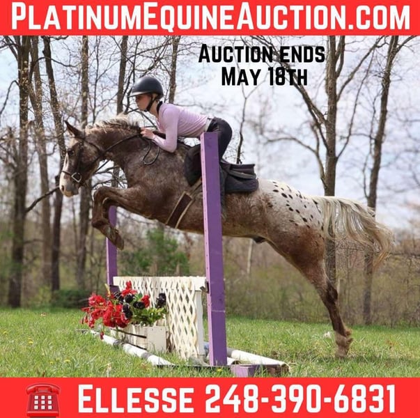 ONLINE AUCTION Place your bids at www.PlatinumEquineAuction.com Starting Bid $3500 Auction ends May 18th, 2025 Need a new saddle? Check out White Rock Saddles on our website or Facebook! I am excited to introduce A SILVER SOL WEEDO, or Silver for short. Here’s a stunning roan varnish pony of the americas with an adorable blanket on his hind quarters. He is a registered POA gelding who stands 14.1hh at 4 years old. He is out of laced in silver who is sired by The Silver Kid who is a hall of fame pony and his sire is TC IMPULSIVE WEEDO, who has sired many show ponies. Silver is extremely affectionate and personable. He loves people and attention. Silver is alert and enjoys a job! He’s a stellar mover with 3 solid gaits and the best flying lead change around. Silver has a beautiful floaty trot, a smooth canter and a soft mouth. He knows how to work on and off of seat and leg pressure. He is extremely soft in the mouth, you can pop a halter and lead on him or a simple neck rope. Silver is jumping around and does so in amazing form. He keeps a quiet canter to the jumps and jumps in stunning form. He loves outside rides! He’s great on the grass hunt field and the trails. His potential is endless. He’s an absolute favorite among the big kids and adults at the farm. If you want a touch of color, a can do attitude and breeding to match Silver is your man! Silver lives in Howell, MI 48855 please call or text Ellesse Schwartz at 248-390-6831 for more information. ONLINE AUCTION Place your bids at www.PlatinumEquineAuction.com Starting Bid $3500 Auction ends May 18th, 2025 Need a new saddle? Check out White Rock Saddles on our website or Facebook!