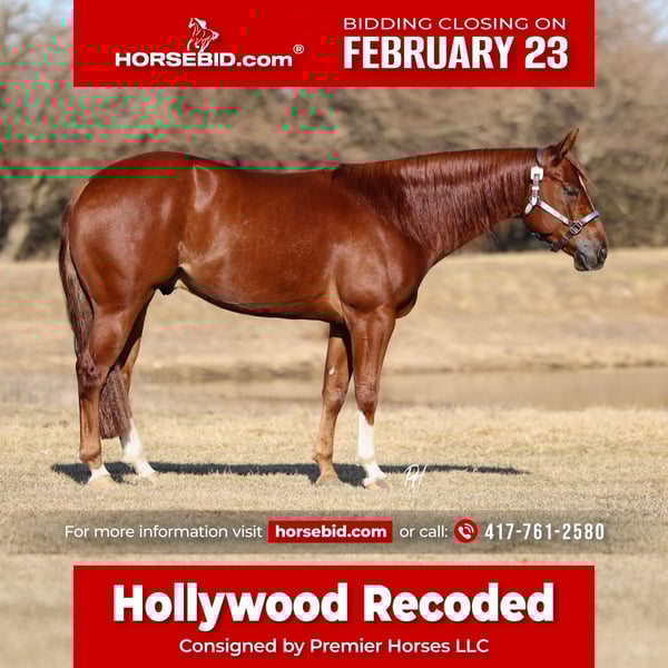 💎 𝐓𝐇𝐄 𝓓𝓲𝓪𝓶𝓸𝓷𝓭 𝐒𝐇𝐎𝐖𝐂𝐀𝐒𝐄 💎 Happening now thru MONDAY | FEBRUARY 23rd - Available EXCLUSIVELY on HorseBid's website! For more details and to register visit: www.Horsebid.com CONSIGNOR CONTACT: Premier Horses LLC 417-761-2580 LOCATION: Buffalo, Missouri 65622 BREED: AQHA REGISTERED: Yes REGISTERED NAME: Hollywood Recoded COLOR: Sorrel HEIGHT: 14.3 AGE: 5 GENDER: Gelding Hollywood Recoded is an exquisite copper penny colored sorrel gelding with undeniable presence. His unique striped face, three white socks, long flowing mane, and thick tail make him stand out in any setting. He has a baby doll head, a strong body, and clean legs. He is balanced, correct, and built to stay sound. He has the kind of look that gets noticed in the warm-up pen and remembered when the class is over. Hollywood is a finished reiner and an NRHA money earner that has only been shown a limited number of times. He is sired by Electric Code (LTE $204,317.26; progeny earnings over $1.4 million) and out of Dunits Juice (LTE $2,416.19; progeny earnings $27,881.86). His pedigree speaks for itself. Over the last six months, Hollywood has been in training under Trent Harvey’s prestigious program, continuing to be polished and maintained at a high level. Hollywood has been shown from Open to Novice level of riders. He offers strong, confident spins, smooth and correct lead changes, round and controlled circles, and deep, eye-appealing stops. He carries himself with natural cadence and stability. He has a beautiful extended trot and comes back to you willingly when asked. He can complete his reining maneuvers bridleless, which shows just how broke and responsive he truly is. Outside the show pen, Hollywood is just as enjoyable. He would transition easily into ranch riding or ranch trail. He goes over obstacles without hesitation and crosses bridges quietly. He is steady on the trails and comfortable to ride all day, crossing water with ease. He will carry the American flag with confidence. He can check the mail or gather cattle when needed. He is ready for someone who wants a competitive show horse today and a versatile partner for years to come. If you are looking for one that combines talent, pedigree, looks, and disposition, He is the complete package. Hollywood has passed a pre-purchase exam and has x-rays on file. .CONSIGNOR CONTACT: Premier Horses LLC 417-761-2580 LOCATION: Buffalo, Missouri 65622 BREED: AQHA REGISTERED: Yes REGISTERED NAME: Hollywood Recoded COLOR: Sorrel HEIGHT: 14.3 AGE: 5 GENDER: Gelding Hollywood Recoded is an exquisite copper penny colored sorrel gelding with undeniable presence. His unique striped face, three white socks, long flowing mane, and thick tail make him stand out in any setting. He has a baby doll head, a strong body, and clean legs. He is balanced, correct, and built to stay sound. He has the kind of look that gets noticed in the warm-up pen and remembered when the class is over. Hollywood is a finished reiner and an NRHA money earner that has only been shown a limited number of times. He is sired by Electric Code (LTE $204,317.26; progeny earnings over $1.4 million) and out of Dunits Juice (LTE $2,416.19; progeny earnings $27,881.86). His pedigree speaks for itself. Over the last six months, Hollywood has been in training under Trent Harvey’s prestigious program, continuing to be polished and maintained at a high level. Hollywood has been shown from Open to Novice level of riders. He offers strong, confident spins, smooth and correct lead changes, round and controlled circles, and deep, eye-appealing stops. He carries himself with natural cadence and stability. He has a beautiful extended trot and comes back to you willingly when asked. He can complete his reining maneuvers bridleless, which shows just how broke and responsive he truly is. Outside the show pen, Hollywood is just as enjoyable. He would transition easily into ranch riding or ranch trail. He goes over obstacles without hesitation and crosses bridges quietly. He is steady on the trails and comfortable to ride all day, crossing water with ease. He will carry the American flag with confidence. He can check the mail or gather cattle when needed. He is ready for someone who wants a competitive show horse today and a versatile partner for years to come. If you are looking for one that combines talent, pedigree, looks, and disposition, He is the complete package. Hollywood has passed a pre-purchase exam and has x-rays on file. .