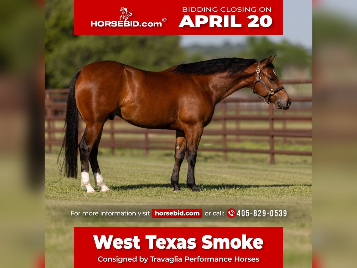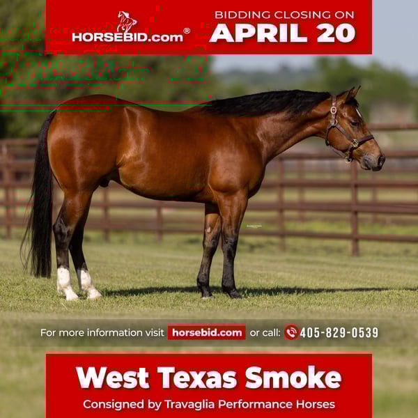 ⚜️𝐭𝐡𝐞 𝓔𝓵𝓲𝓽𝓮 𝐒𝐩𝐫𝐢𝐧𝐠 𝐂𝐥𝐚𝐬𝐬𝐢𝐜⚜️ Happening now thru MONDAY | APRIL 20th - Available EXCLUSIVELY on HorseBid's website! For more details and to register visit: www.Horsebid.com CONSIGNOR CONTACT: Travaglia Performance Horses 405-829-0539 LOCATION: Burleson, TX BREED: Aqha REGISTERED: Yes REGISTERED NAME: West Texas Smoke COLOR: Bay HEIGHT: 14.3 AGE: 5 GENDER: Gelding If you’re searching for a gelding that can be used on your ranch or ridden down the trail one day and confidently step into the performance arena the next, meet Maverick! A gorgeous, 5-year-old bay gelding with a heart as big as his stop, Maverick has had great training his entire life, giving him a solid foundation built on consistency, trust, and care. He’s exceptionally personable, always willing, curious, and full of character. Maverick is a trained reining horse, and rope horse that has been hauled and shown, Maverick won over 10,000 dollars last year at the roping futurities, he placed 5th in the world in the Junior Tiedown Roping at the AQHA World Show, he has been hauled to and won money at multiple jackpots, rodeos, and AQHA shows in the tiedown and breakaway roping and has been used for all aspects of ranch work. In the roping pen Maverick pluses all maneuvers he stands in the box like a statue and leaves flat and smooth every time he tracks and positions cattle automatically giving you the same shot everytime, he patiently waits for you to rope before he stops effortlessly. Maverick has been ridden and competed on by riders of all levels, professionals, amateurs, kids, men and women and he caters to the riders needs Every time. Maverick is the type of horse that you can make a living on hauling to ropings, rodeos, and shows. He would make a great ranch rider. He has been around cattle and rode miles outside. Whatever you set your mind to he has had the miles and training to be right there with you! Maverick goes exactly at the pace you ask. He naturally slows down without hesitation, yet he is equally happy to step up when asked. His jog, lope, and long trot are smooth, balanced, and comfortable, making every ride a joy. He has a huge, confident stop, clean, easy turnarounds, and effortless lead departures. Whether it’s a simple ride around the ranch or a trail ride across varied terrain, or roping a calf or steer Maverick remains steady, responsive, and confident every step of the way. He’s been around cattle and navigates new situations or arenas with ease. On the ground, Maverick is just as easygoing. Polite, kind, and fun to be around, he has a personality that keeps you smiling—expressive, affectionate, and always eager for scratches or treats. He’s a gentleman in the stall, excellent in cross-ties, loads and hauls without issue.Maverick is sound, well-built, and just all around dependable. He’s a horse you can ride every day—or give a week or two off and jump back on, confident that he’ll be exactly the same. With smooth, balanced gaits, a willing attitude, and a big personality, Venom is versatile, consistent, and ready to become your next lifelong partner. Pedigree-wise, Maverick is sired by A Vintage Smoke , an earner of $600,600 and a Million Dollar Sire. His dam, Spark Command, producer of money earners over 60k is a daughter of the legendary, Shining Spark giving Maverick both the talent and mind that riders look for. Maverick is up to date on vaccinations, has clean X-rays and is located in Burleson, Texas, we welcome anyone to come meet and try Maverick to see for themselves why we love him so much. If you’re looking for a horse with the heart, talent, and personality to be both a competitive partner, don’t let this one pass you by. We can help arrange hauling and have shipped horses all over the United States and even internationally! Don’t hesitate to call us with any questions!