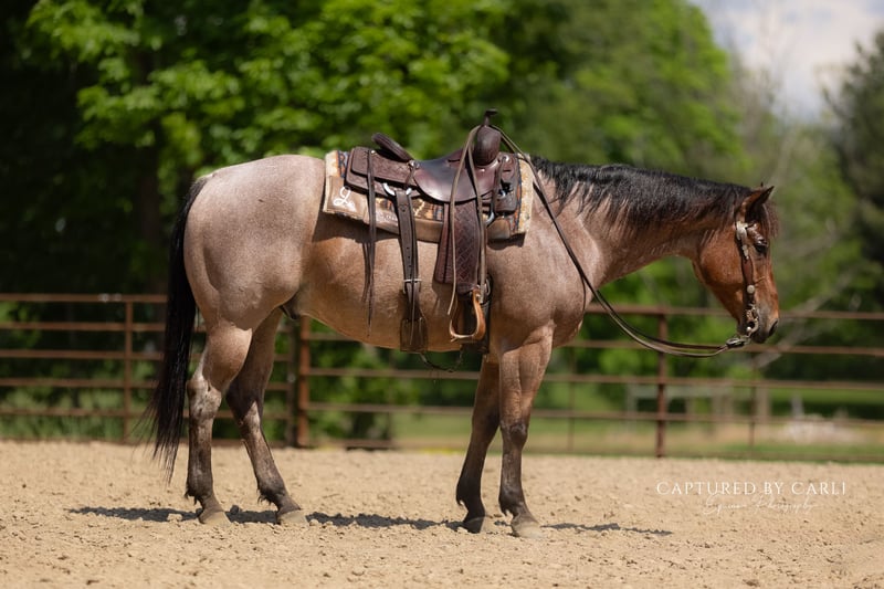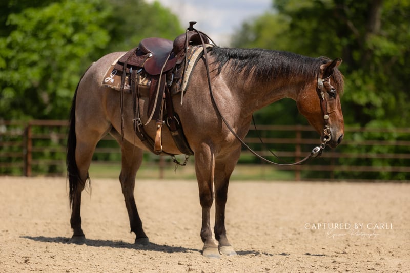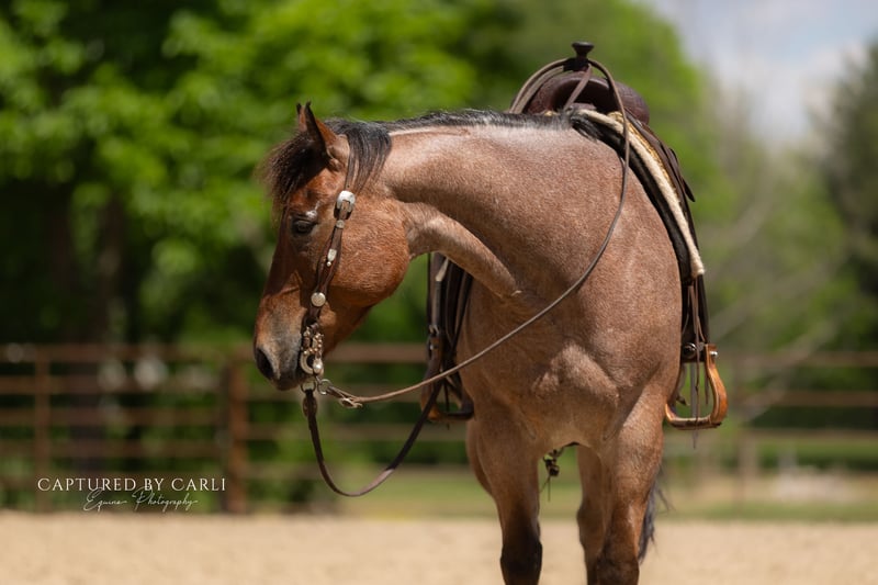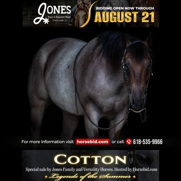 𝐉𝐨𝐧𝐞𝐬 𝐅𝐚𝐦𝐢𝐥𝐲 & 𝐕𝐞𝐫𝐬𝐚𝐭𝐢𝐥𝐢𝐭𝐲 𝐇𝐨𝐫𝐬𝐞𝐬' ✯𝑳𝒆𝒈𝒆𝒏𝒅𝒔 𝒐𝒇 𝒕𝒉𝒆 𝑺𝒖𝒎𝒎𝒆𝒓✯ Happening now thru THURSDAY | AUGUST 21st - Available EXCLUSIVELY on HorseBid's website! For more details and to register visit: www.Horsebid.com CONSIGNOR CONTACT: Jones Family and Versatility Horses 618-535-9966 LOCATION: Lewistown, IL BREED: Quarter Horse REGISTERED: Yes REGISTERED NAME: Blue Metallic Pistol COLOR: Bay Roan HEIGHT: 14.3 AGE: 5 GENDER: Gelding If you’re in the market for a top-shelf gelding with the looks, bloodlines, and brain to go in absolutely any direction, take a good look at Cotton. This 5-year-old AQHA gelding stands 14.3 hands and is an own son of the standout sire Metallic Malice—bringing both talent and eye appeal to the table. Cotton has been used extensively for all aspects of ranch work and is as solid and dependable as they come. He’s been there, seen it, and handled it with a cool, quiet mind. Whether you’re gathering cattle, dragging calves, or riding pens, Cotton handles the job with professionalism and a good attitude every time. He’s surefooted outside, confident alone, and always willing to step up to the task. One of the first things you’ll notice about Cotton is his personality—this gelding loves people. He’s the type that meets you at the gate, enjoys attention, and forms a bond with his rider. He’s got that rare mix of charisma and kindness that makes him truly one of a kind. Under saddle, Cotton has a fancy, well-rounded handle—soft in the face, responsive to your leg, and smooth-moving. He neck reins, moves off your seat, stops deep, and turns around correctly. Yet for all his training, he stays quiet, gentle, and forgiving. Cotton has the kind of mind that allows a green rider to learn safely while still offering the buttons and feel an experienced hand can appreciate and enjoy. He’s ready for the ranch versatility pen, would make a super rope horse prospect, or could easily go on to excel in any number of western performance disciplines. More than anything, Cotton is the kind of horse that just wants to please. He’s happy anywhere you take him—arena, pasture, trail, or show pen—and he brings consistency and confidence every time. Safe, broke, versatile, and personable—Cotton truly is the total package. Horses like him don’t come around every day, and he’s the kind you’ll enjoy owning for years to come.